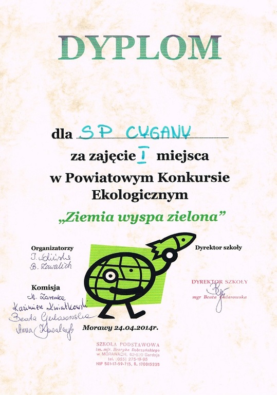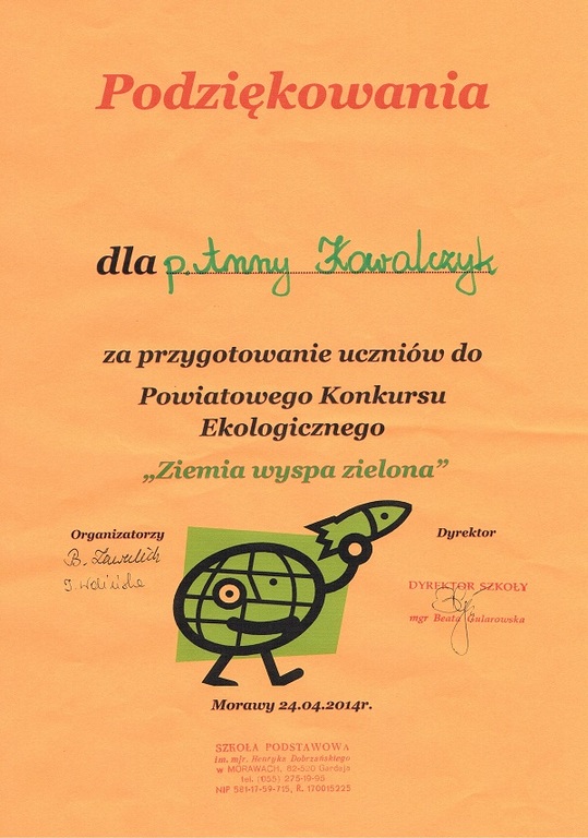 W dniu 24 kwietnia 2014 roku reprezentacja uczniów  klas I-III nasze szkoły pod opieką                     pani Anny Kowalczyk wzięła udział w XII Powiatowym Konkursie Ekologicznym pt. „Ziemia wyspa zielona” w Szkole Podstawowej im. mjr. Henryka Dobrzańskiego w Morawach. Uczennice, które brały udział w zmaganiach przyrodniczo – ekologicznych i plastycznych to: