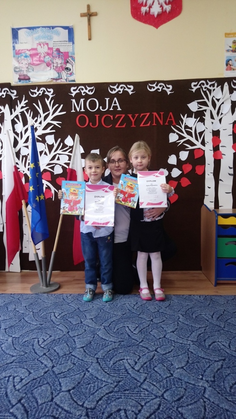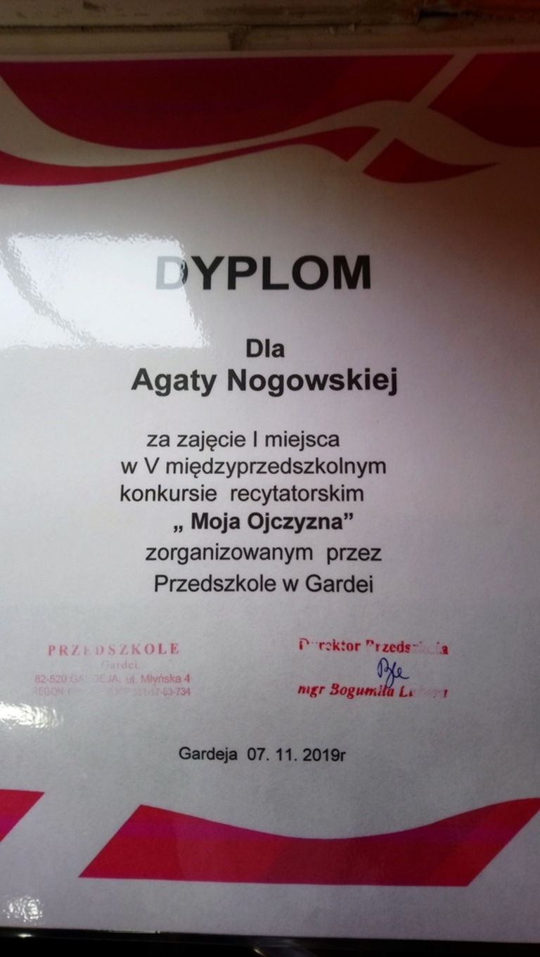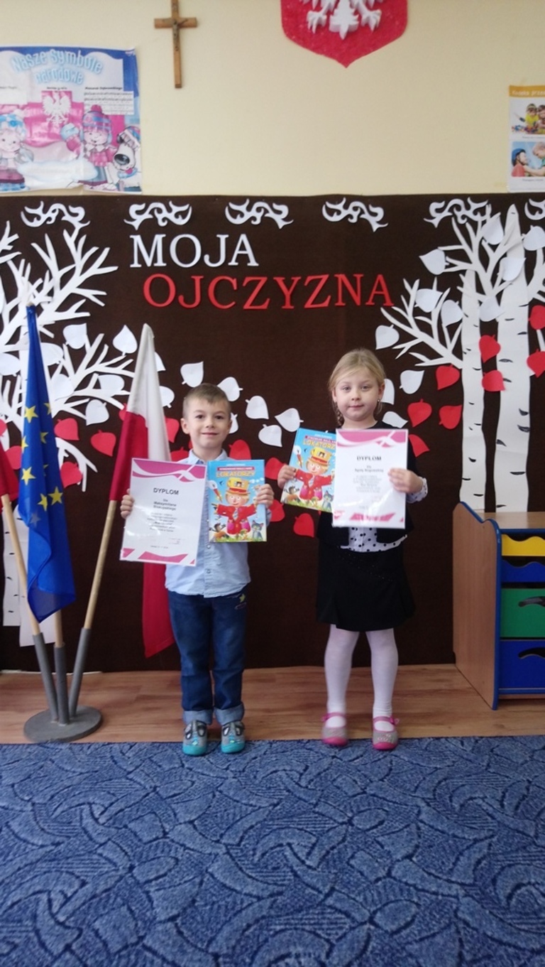 "MOJA OJCZYZNA" to konkurs recytatorki dla przedszkoli i oddziałów przedszkolnych, który odbył się w Gardei. Naszą szkołę reprezentowały najmłodsze dzieci Agatka Nogowska oraz Maksymilian Biskupski pod opieką wychowawczyni Kingii Barańskiej. Konkurs miał na celu kształtowanie poczucia przynależności oraz szacunku do ojczyzny. Zostaliśmy przepięknie ugoszczeni przez dyrekcję oraz nauczycielki przedszkola. Razem zaśpiewaliśmy hymn Polski, obejrzeliśmy występy dzieci z grup 5 i 6 latków z gardejskiego przedszkola oraz recytację innych uczestników konkursu. Nasi reprezentanci przepięknie wyrecytowali wiersze "Co to jest Polska?" Cz. Janczarskiego oraz "Moja mała ojczyzna" J. Białobrzeskiej, który okazał się faworytem konkursy. Poziom recytacji był tak wysoki, iż jury jednomyślnie ogłosiło, że wszystkie dzieci zajęły pierwsze miejsce. Finał konkursu uwieńczyło rozdanie dyplomów, nagród książkowych oraz słodkich upominków. Jeszcze raz gratulujemy zwycięzcom!