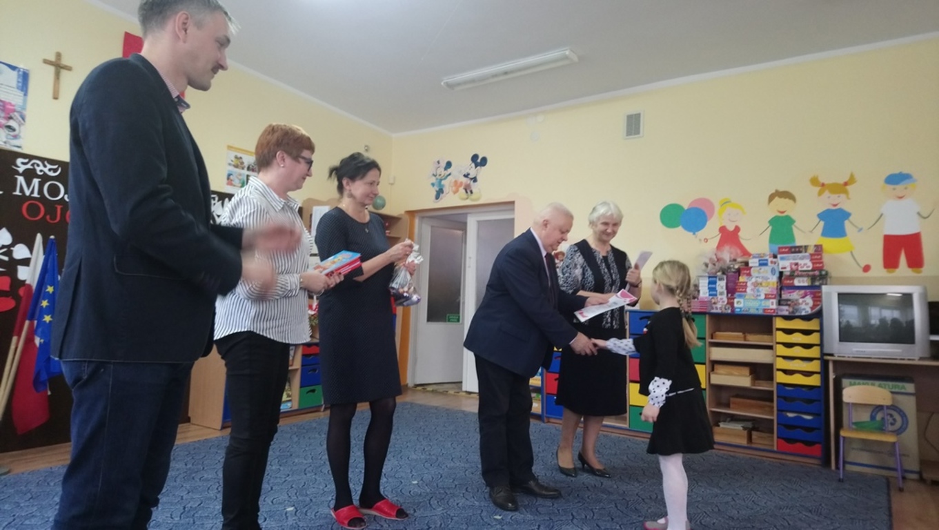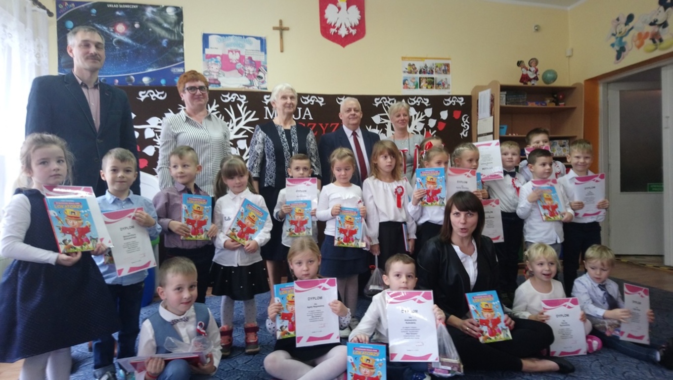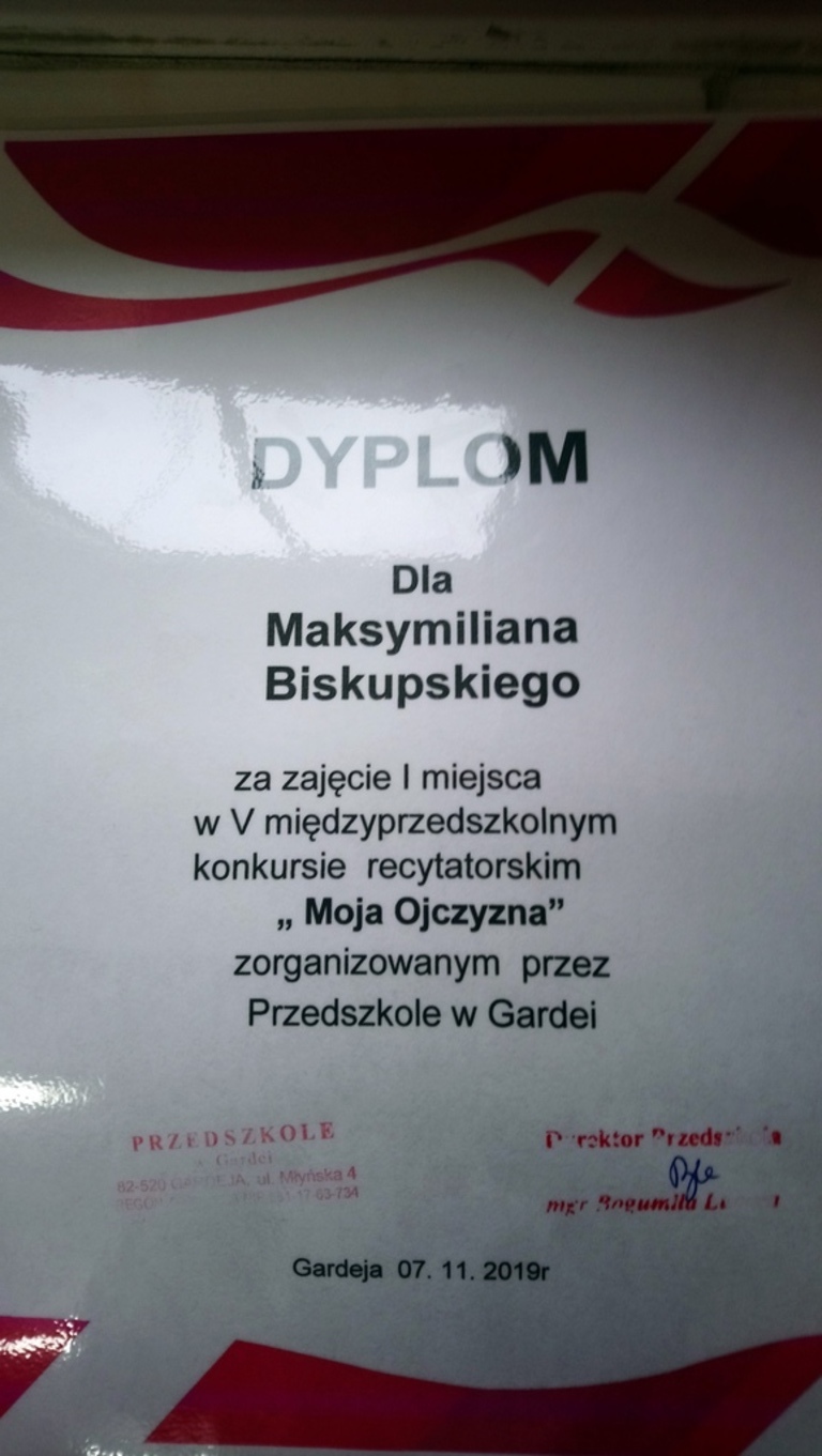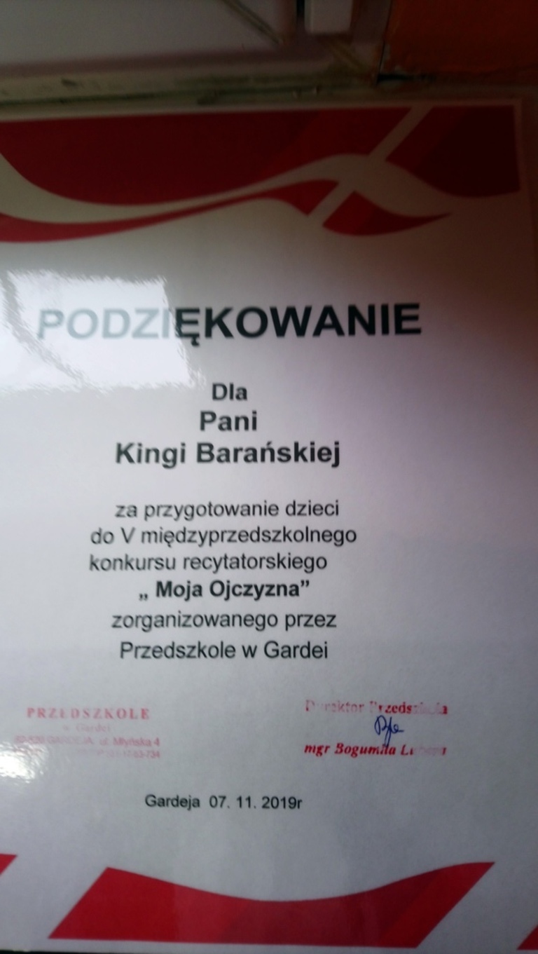 "MOJA OJCZYZNA" to konkurs recytatorki dla przedszkoli i oddziałów przedszkolnych, który odbył się w Gardei. Naszą szkołę reprezentowały najmłodsze dzieci Agatka Nogowska oraz Maksymilian Biskupski pod opieką wychowawczyni Kingii Barańskiej. Konkurs miał na celu kształtowanie poczucia przynależności oraz szacunku do ojczyzny. Zostaliśmy przepięknie ugoszczeni przez dyrekcję oraz nauczycielki przedszkola. Razem zaśpiewaliśmy hymn Polski, obejrzeliśmy występy dzieci z grup 5 i 6 latków z gardejskiego przedszkola oraz recytację innych uczestników konkursu. Nasi reprezentanci przepięknie wyrecytowali wiersze "Co to jest Polska?" Cz. Janczarskiego oraz "Moja mała ojczyzna" J. Białobrzeskiej, który okazał się faworytem konkursy. Poziom recytacji był tak wysoki, iż jury jednomyślnie ogłosiło, że wszystkie dzieci zajęły pierwsze miejsce. Finał konkursu uwieńczyło rozdanie dyplomów, nagród książkowych oraz słodkich upominków. Jeszcze raz gratulujemy zwycięzcom!