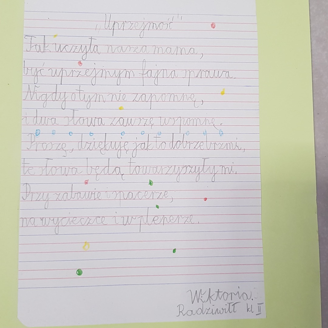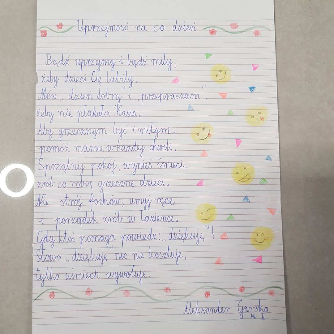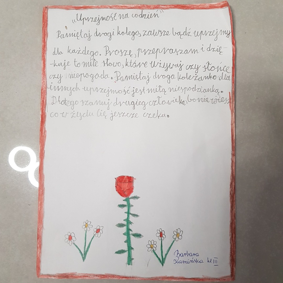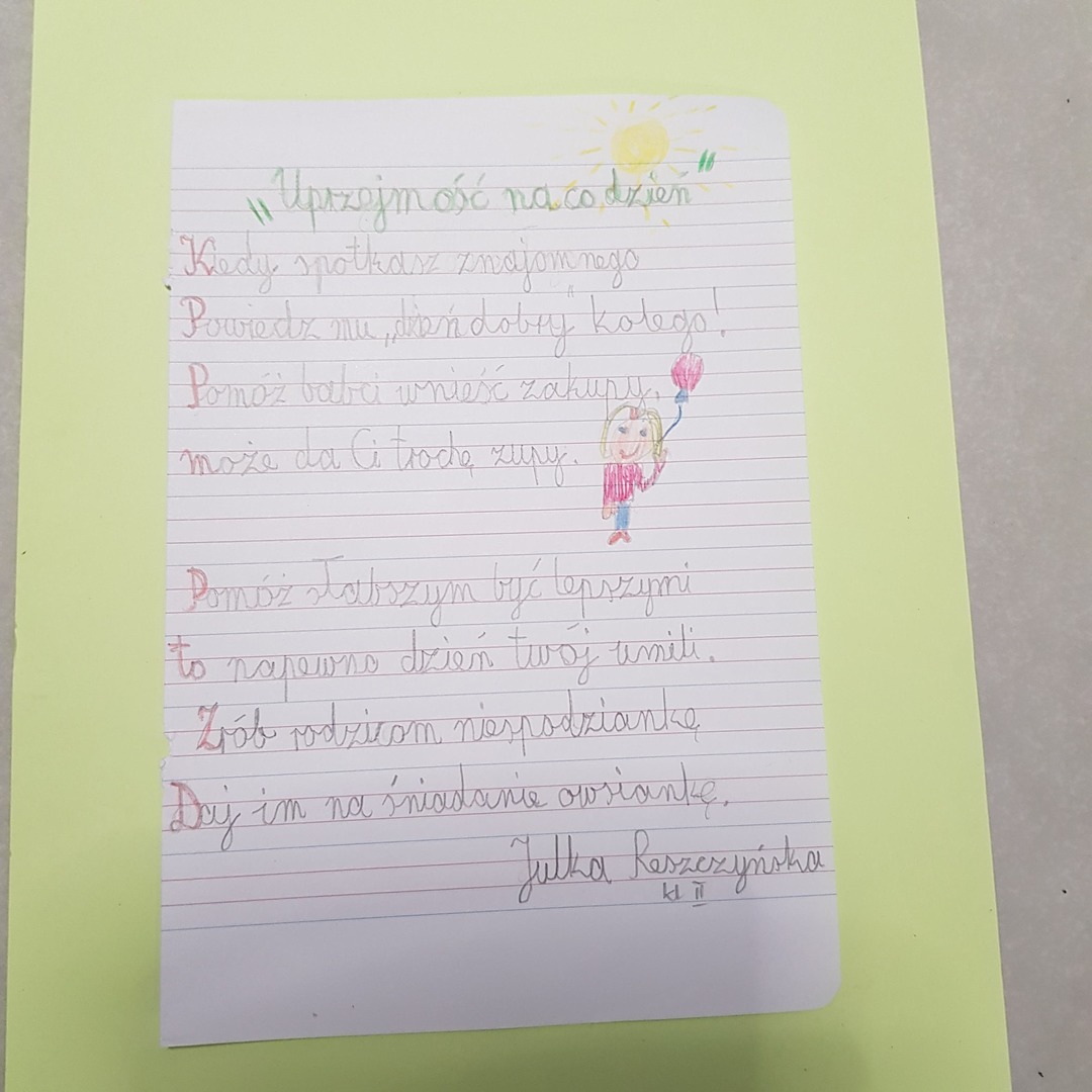 ,,Kasowy Portal Życzliwości”. Uczniowie pisali do siebie miłe słówka z pozdrowieniami. Tego dnia również rozstrzygnięty został Konkurs dla kl. 2 i 3 na napisanie wiersza zgodnego z tematem ,,UPRZEJMOŚĆ NA CO DZIEŃ