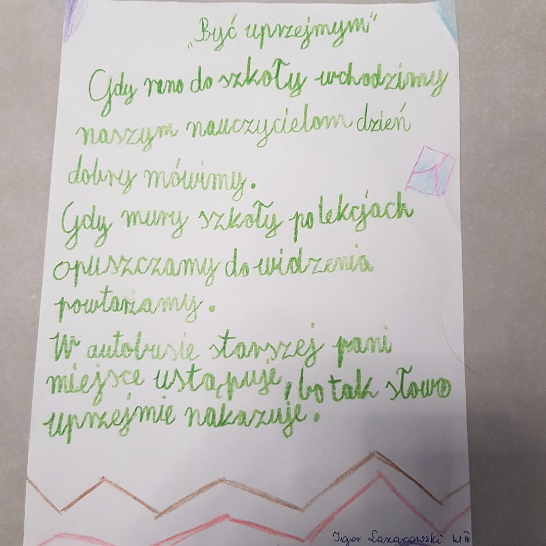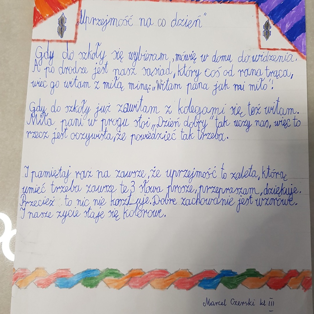 Uczniowie klas IV- VIII wykonali plakaty dotyczące uprzejmości i przestrzegania zasad savoir – vivre’u. Tego dnia odbył się również konkurs poetycki dla kl. 2 i 3 pod hasłem ,, Uprzejmość na co dzień”.