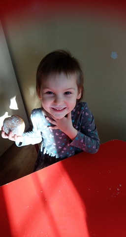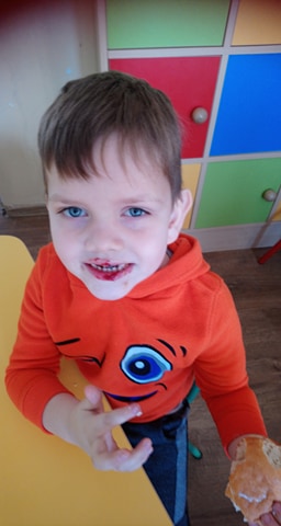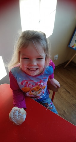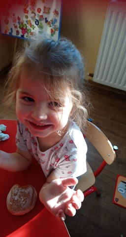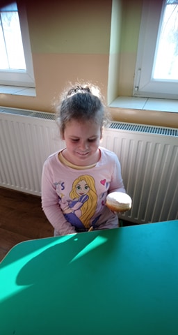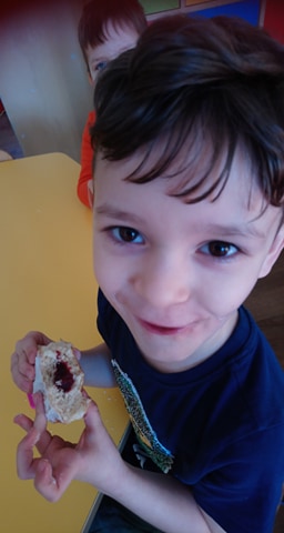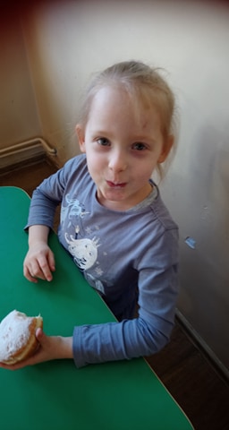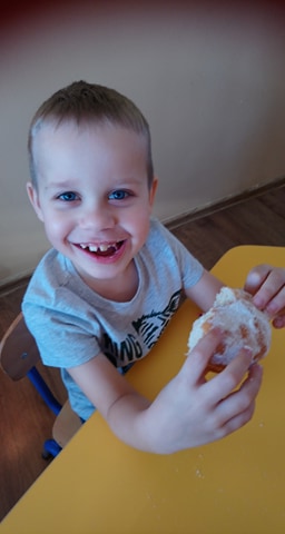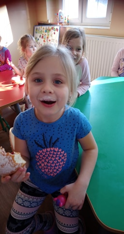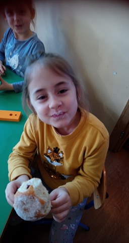 zajądając się przepysznymi pączkami z czekoladą oraz cukrem pudrem. Szczęśliwe miny można zobaczyć na fotografiach