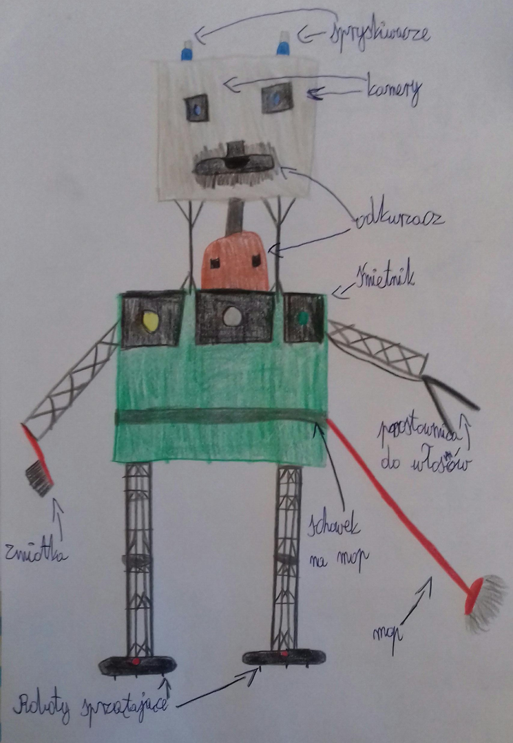 Uczniowie klasy VI zainspirowani pomysłami bohaterów literackich, zaprojektowali i opisali własne roboty. Jak wyglądają, można zobaczyć w galerii. Do czego służą, to już nasza słodka tajemnica. Wy też możecie uruchomić wyobraźnię, patrząc na nie. Za twórcze podejście do tematu dziękuje nauczyciel j. polskiego – p. Dorota Kurjata