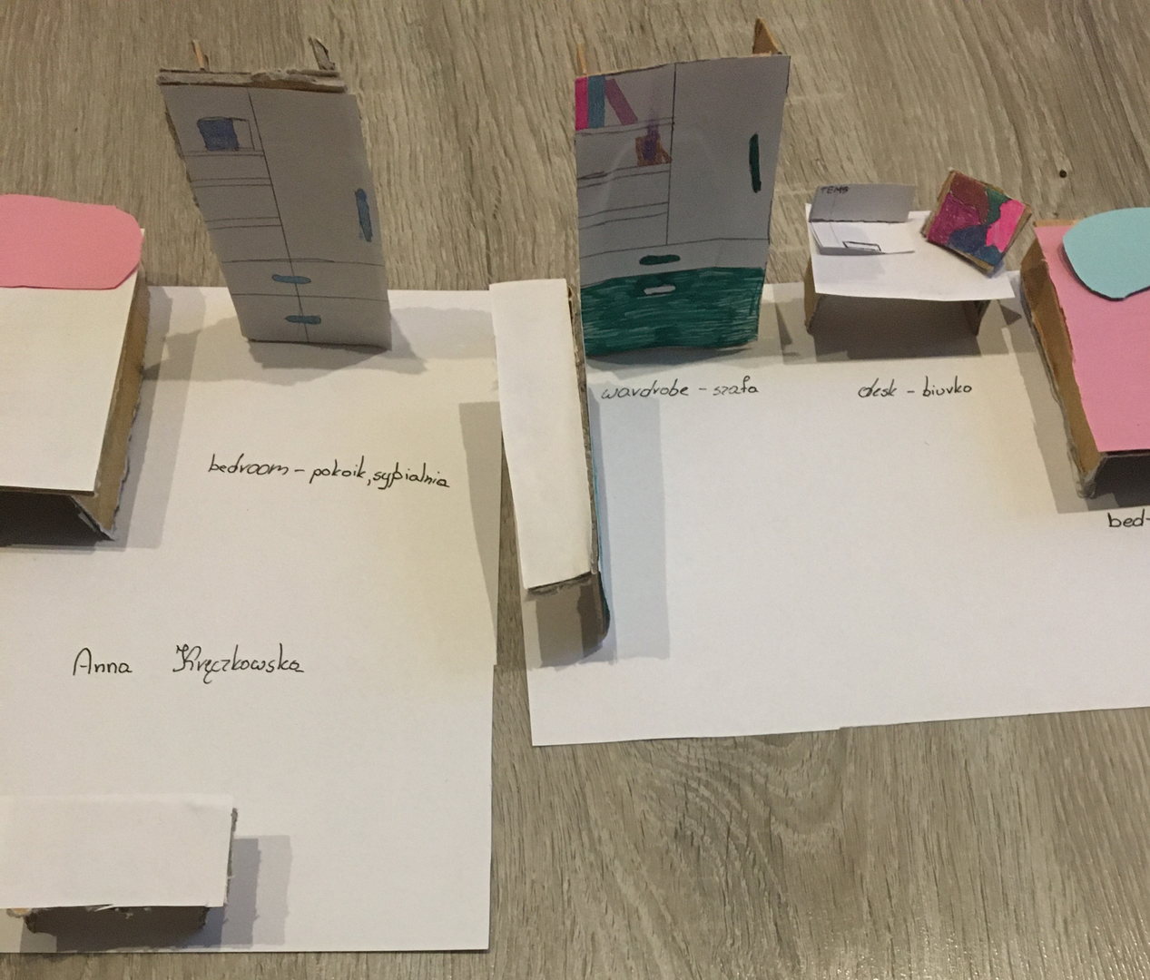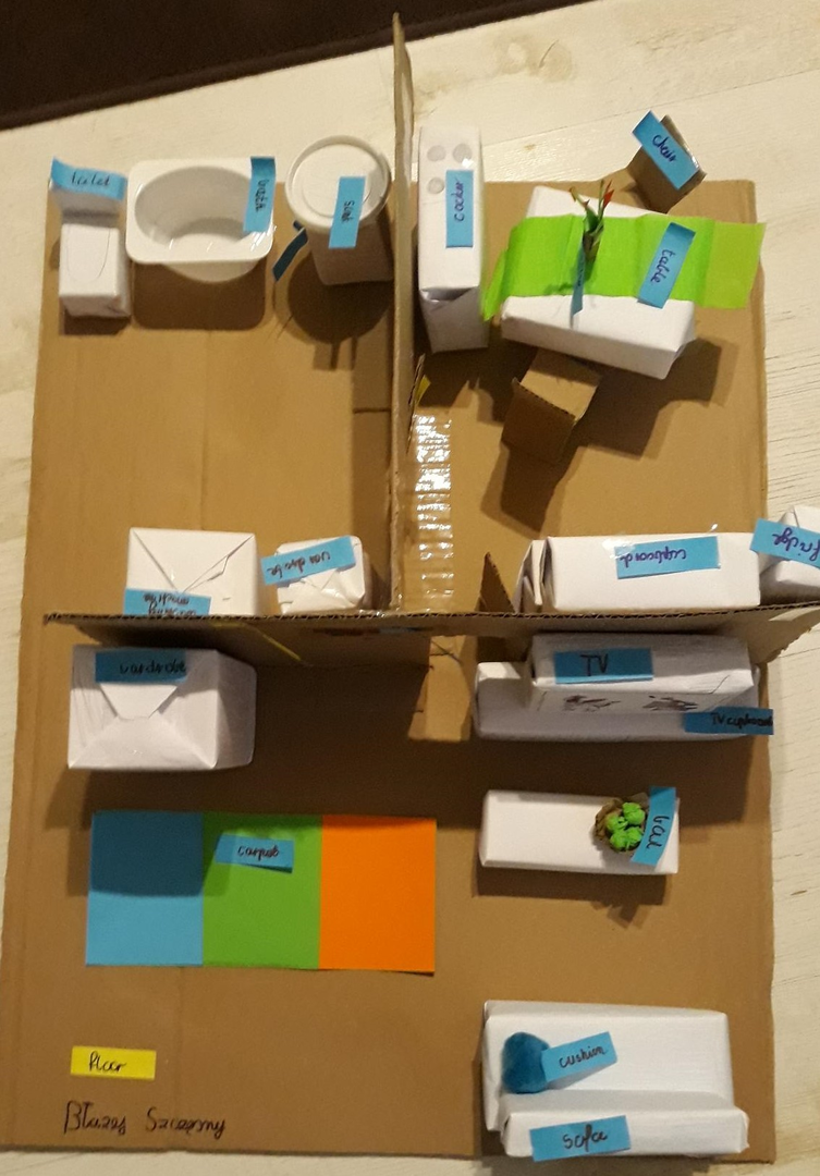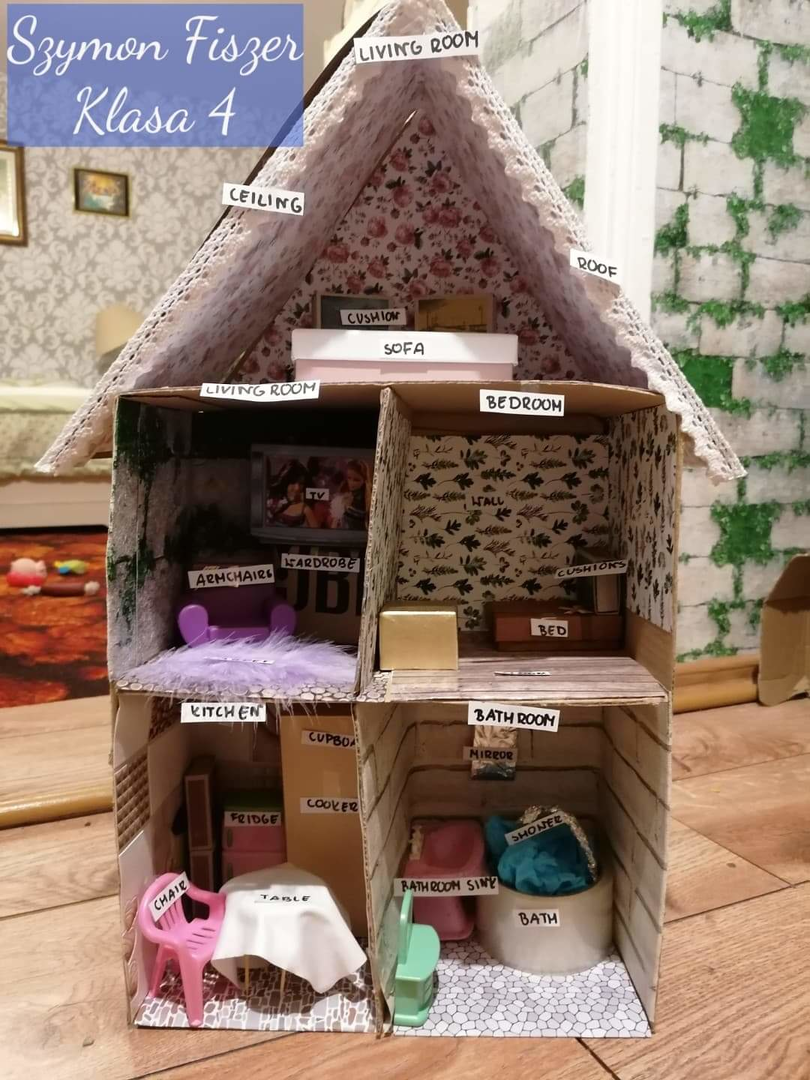W dniach 18 – 22 marca uczniowie klasy czwartej, w związku z wprowadzeniem i utrwaleniem słownictwa dotyczącego pomieszczeń w domu, wykonali projekty pod tytułem „My house”. Każdy uczeń narysował plan swojego domu lub mieszkania a następnie przykleił odpowiedni podpis.
