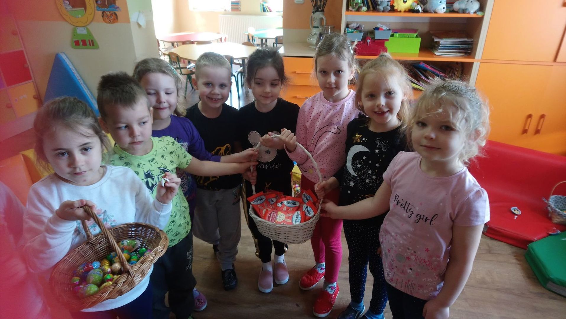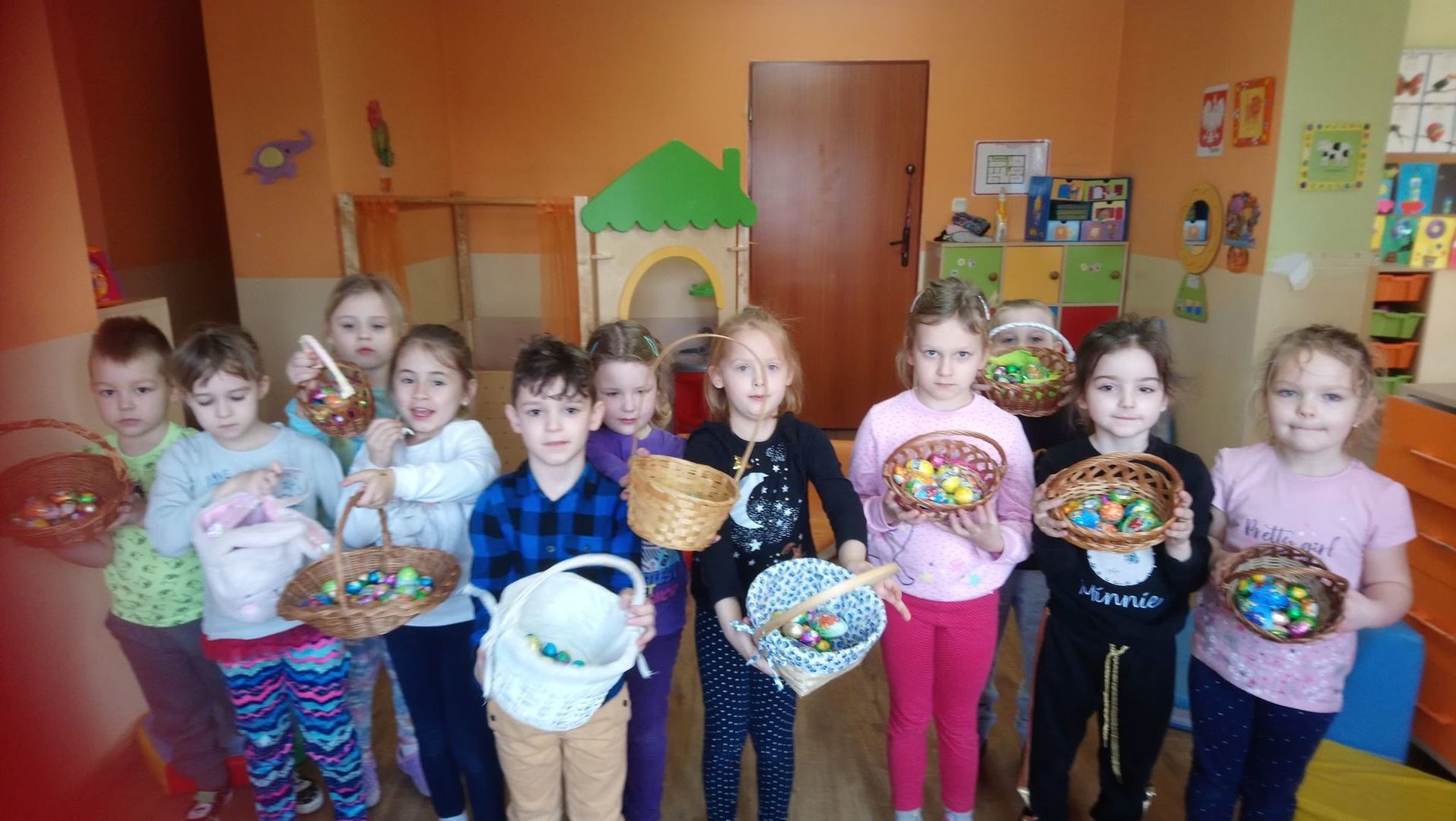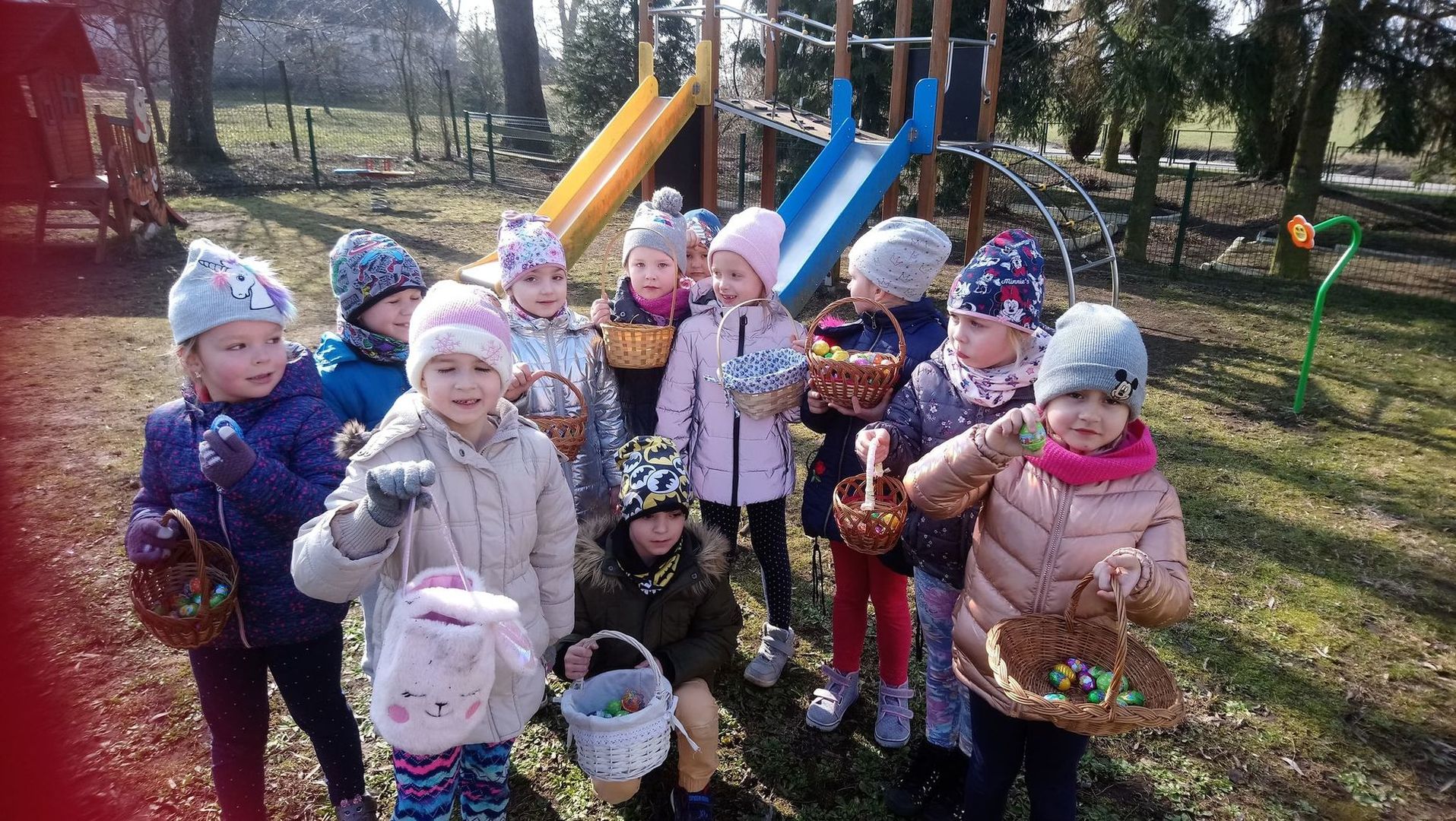 W tym roku dzieci z oddziału przedszkolnego zaprosiły do przedszkola Zajączka Wielkanocnego, który pochował w ogrodzie czekoladowe jajeczka. Sprytny zając powymyślał takie kryjówki, że przedszkolaki jeszcze później podczas zabawy znajdowały pochowane słodkości. Zabawy było co nie miara, a spryt i zwinność dzieci zaowocowała udanymi zbiorami. Następnie w sali przedszkolnej przeliczaliśmy nasze zdobycze, które zostały potem sprawiedliwie podzielone. W słodkich nastrojach życzymy oglądającym naszą galerię - Wesołych i zdrowych Świąt Wielkanocnych. Dzieci z oddziału przedszkolnego oraz wychowawca Kinga Barańska.