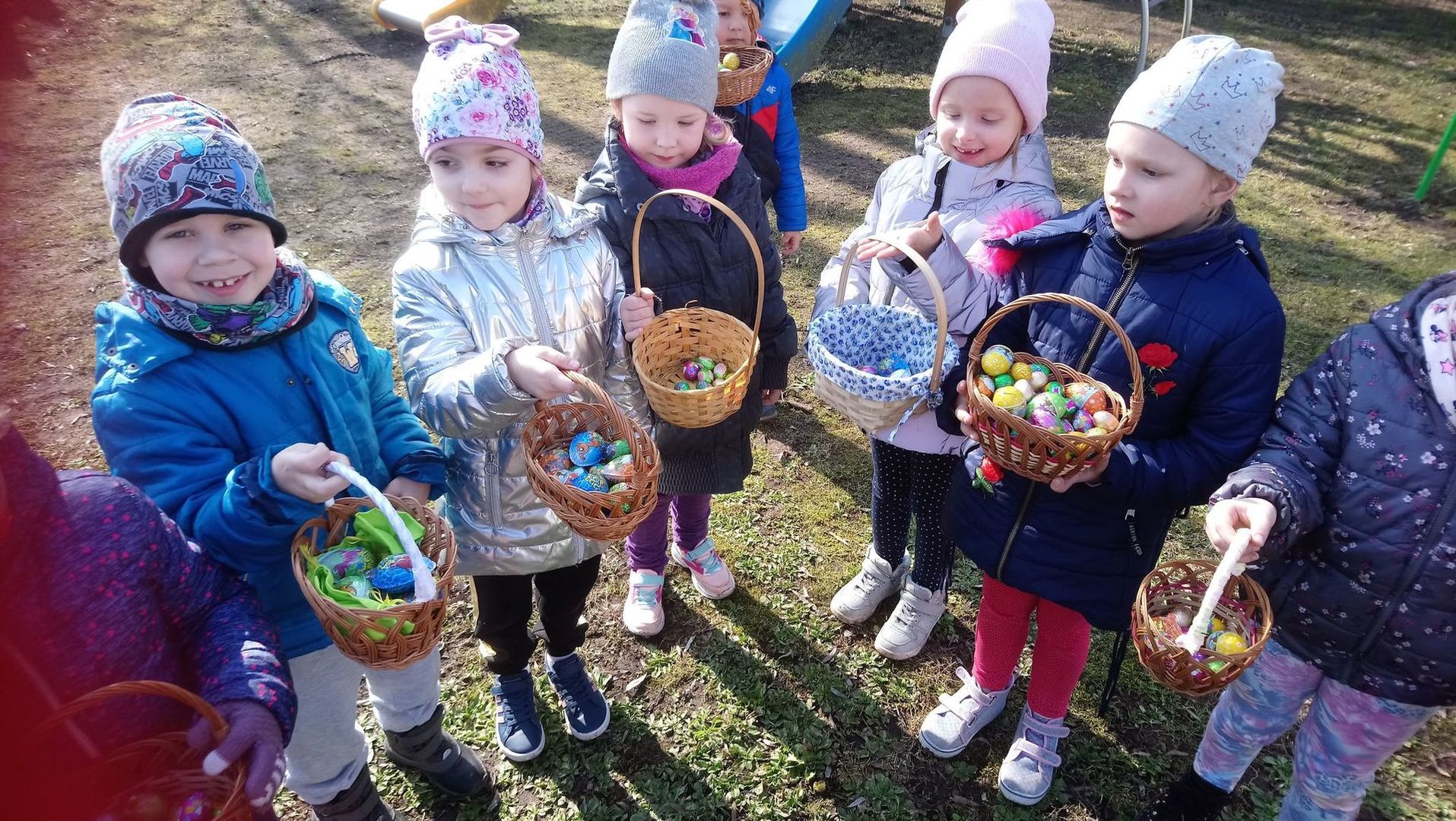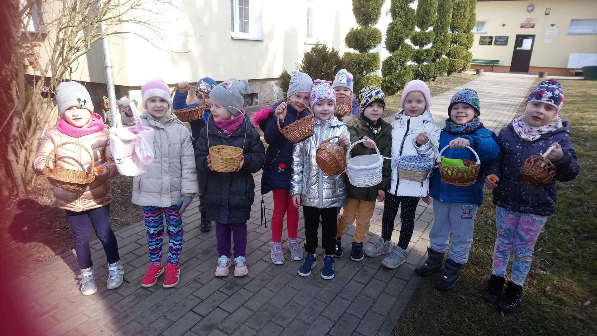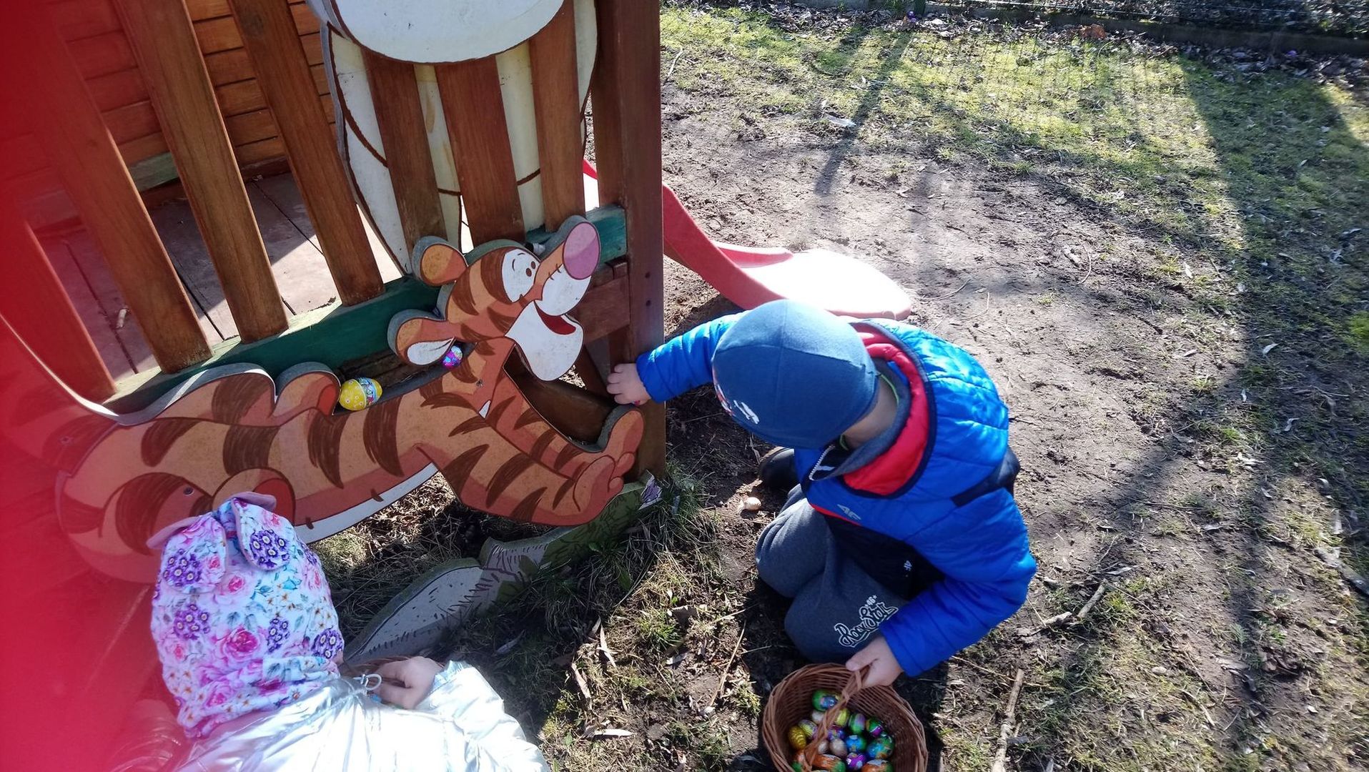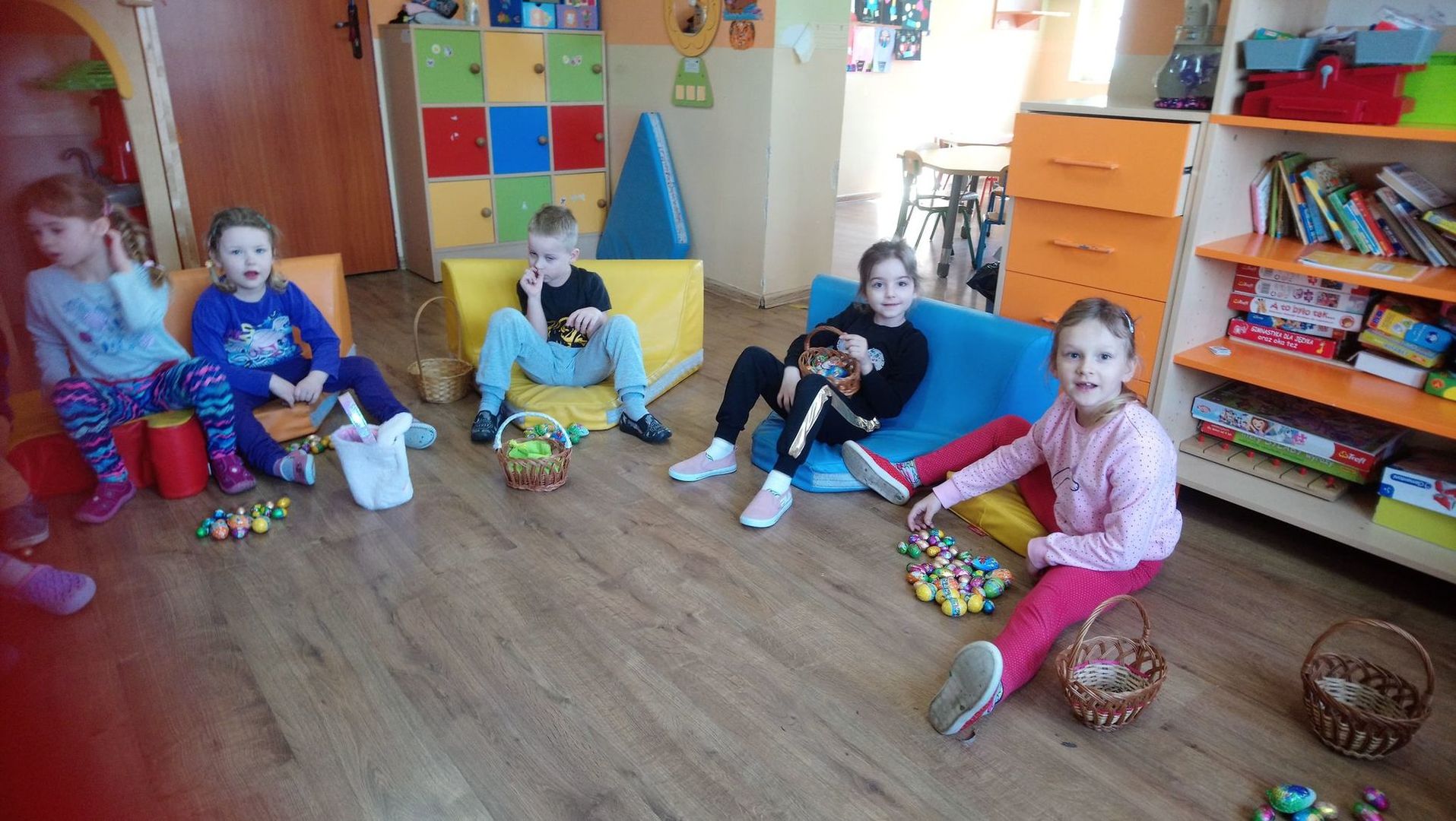 W tym roku dzieci z oddziału przedszkolnego zaprosiły do przedszkola Zajączka Wielkanocnego, który pochował w ogrodzie czekoladowe jajeczka. Sprytny zając powymyślał takie kryjówki, że przedszkolaki jeszcze później podczas zabawy znajdowały pochowane słodkości. Zabawy było co nie miara, a spryt i zwinność dzieci zaowocowała udanymi zbiorami. Następnie w sali przedszkolnej przeliczaliśmy nasze zdobycze, które zostały potem sprawiedliwie podzielone. W słodkich nastrojach życzymy oglądającym naszą galerię - Wesołych i zdrowych Świąt Wielkanocnych. Dzieci z oddziału przedszkolnego oraz wychowawca Kinga Barańska.