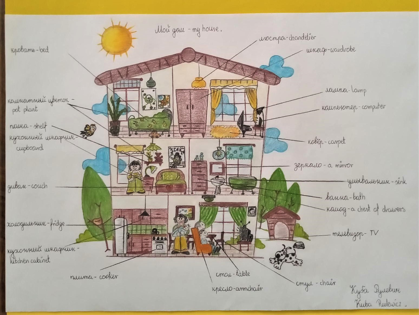 W dniach 12 – 25 kwietnia uczniowie klasy siódmej, w związku z wprowadzeniem nowego słownictwa w języku rosyjskim, dotyczącego pomieszczeń w domu oraz mebli i sprzętów, wykonali projekt pod tytułem „Мой дом”. Uczniowie narysowali plan swojego domu lub mieszkania, a następnie podpisali odpowiednie obrazki w języku rosyjskim i angielskim. Warto dodać, że Uczniowie podjęli naukę języka rosyjskiego w tym roku i tak pięknie radzą sobie z pisaniem cyrylicą.