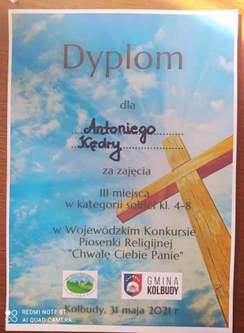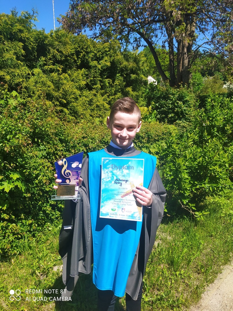 Dnia 31 maja 2021 roku w sali koncertowej Gminnego Ośrodka Kultury w Kolbudach położonego w powiecie gdańskim odbył się finał Wojewódzkiego Konkursu Piosenki Religijnej "Chwalę Ciebie Panie". Uczeń naszej szkoły Antoni Kędra zajął III miejsce w kategorii soliści klas 4-8 rywalizując z 13 uczestnikami w swojej kategorii wiekowej z województwa pomorskiego. Uczeń wykonał utwór pt. ,,Nie ma Go tu, wstał!”. Do konkursu Antoniego przygotował katecheta Karol Kędra. W wojewódzkim konkursie piosenki, koordynowanym przez Zespół Kształcenia i Wychowania w Bielkówku, zaprezentowało się wielu młodych wokalistów z różnych części województwa pomorskiego. W pierwszym etapie konkursu należało wysłać nagrany utwór. Finaliści zaprezentowali utwory na scenie przed komisją konkursową, która wyłoniła zwycięzców. Konkurs odbył się w III kategoriach: kategoria soliści klas 1-3, kategoria soliści klas 4-8 i kategoria zespoły. Serdecznie gratulujemy naszemu młodemu wokaliście Antoniemu kolejnego sukcesu muzycznego oraz Panu Karolowi zdolnego syna i ucznia. Życzymy dalszych sukcesów.