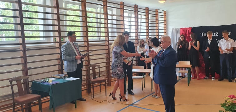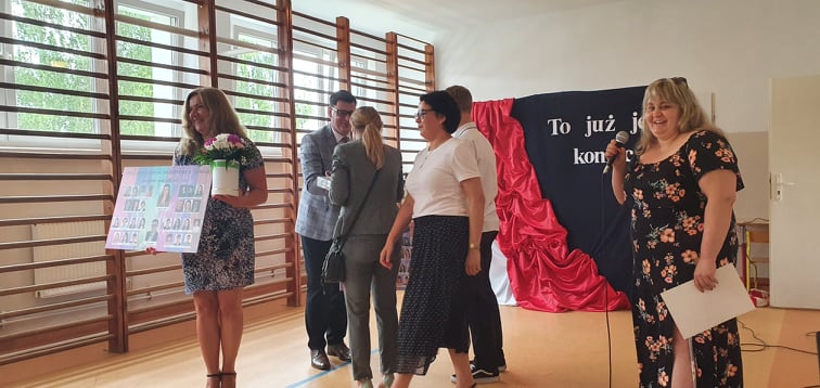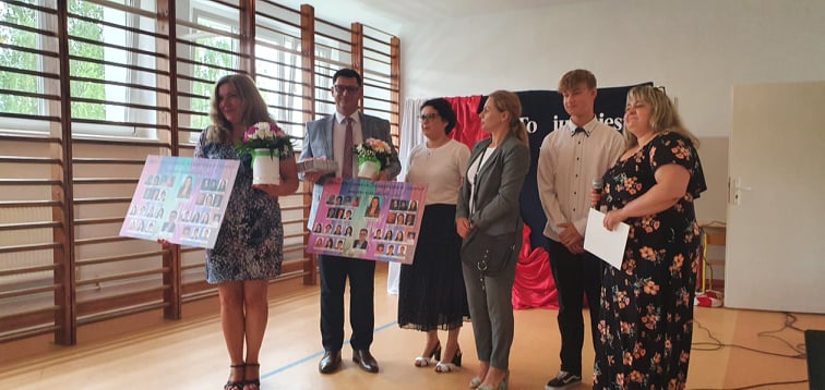 Po ich zakończeniu cała klasa ponownie wyszła na środek sali by podziękować za wspólnie spędzone lata. Finalnie uczniowie wraz z rodzicami zaprezentowali okolicznościowe tablo oraz wręczyli kwiaty wszystkim nauczycielom i pracownikom szkoły.