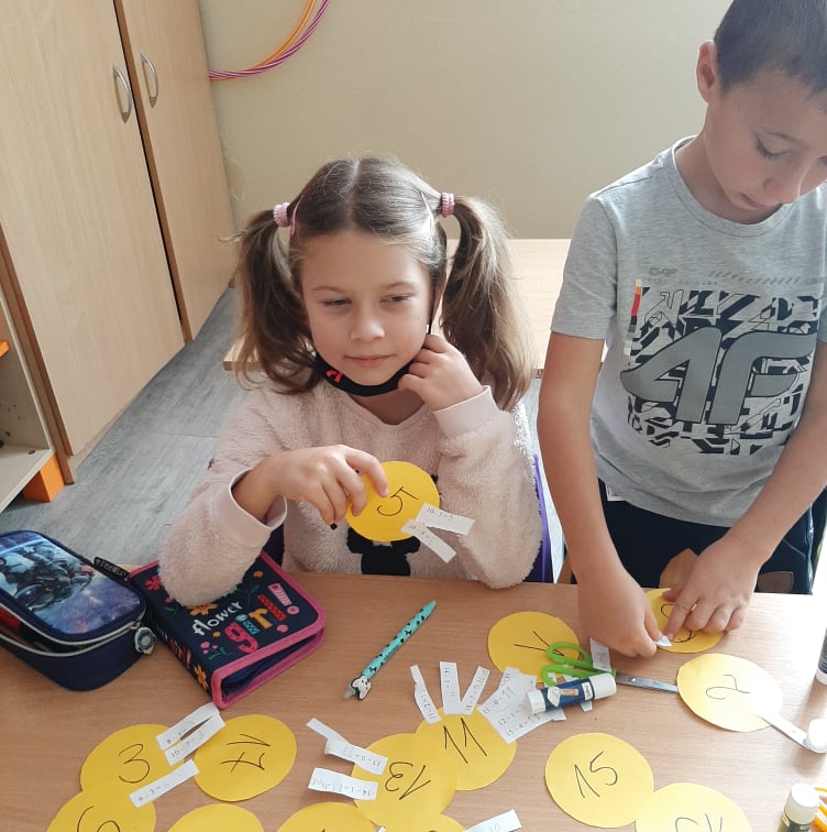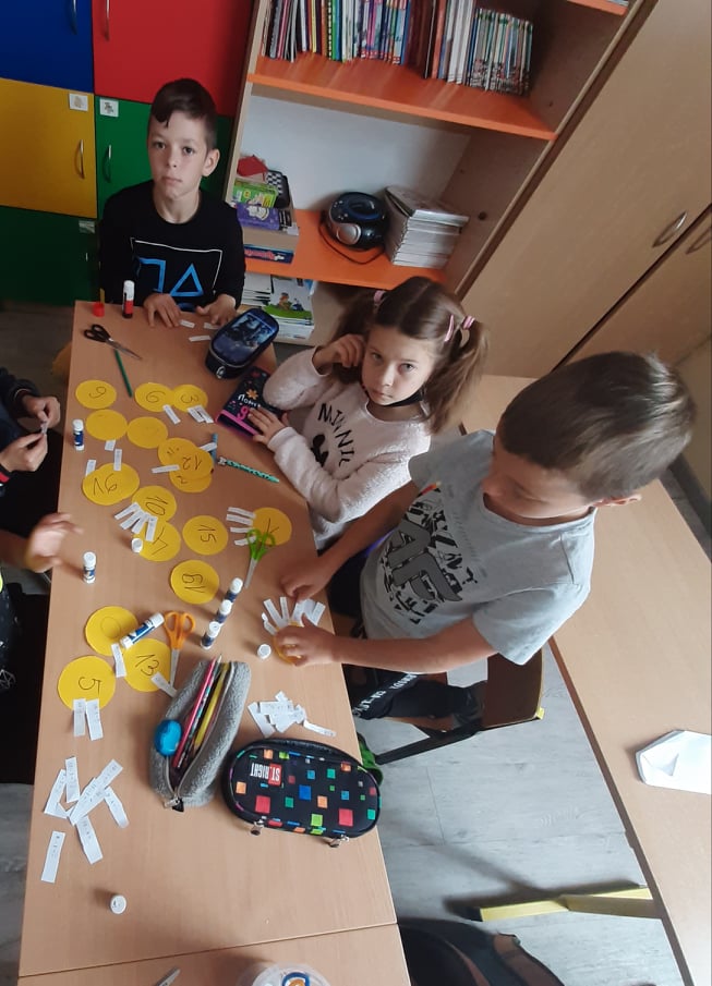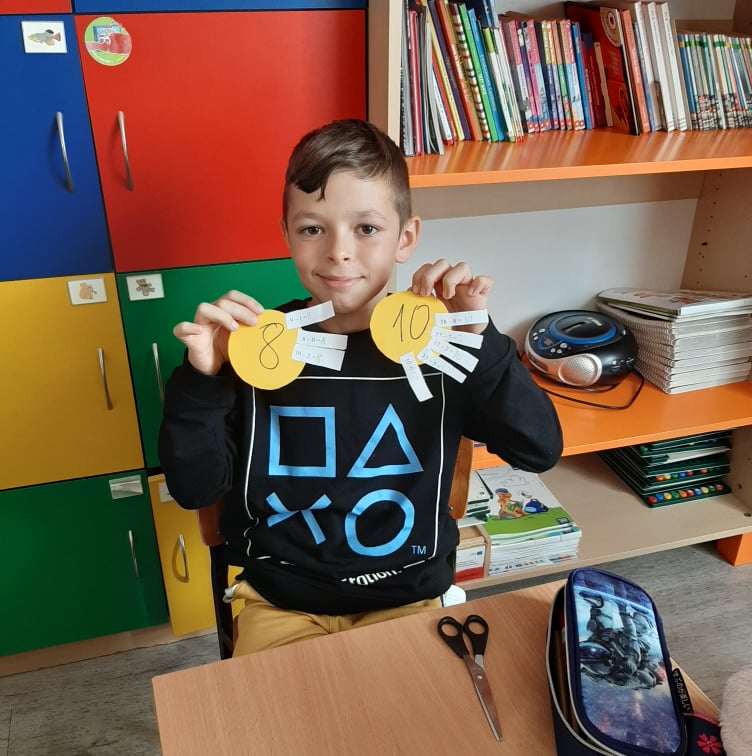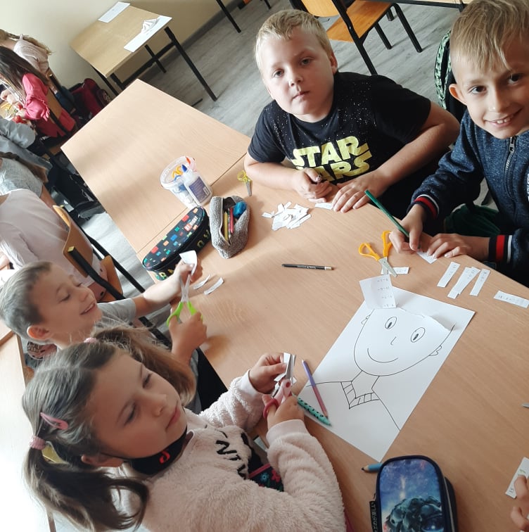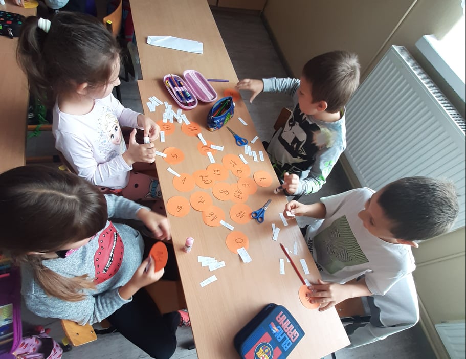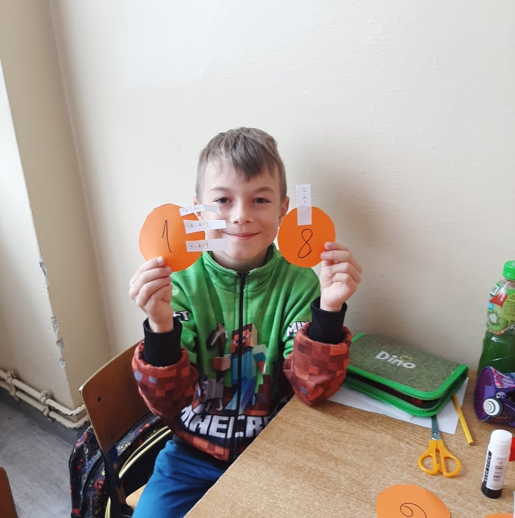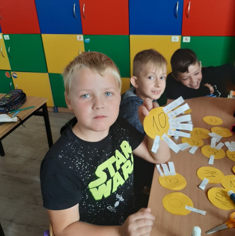 Klasa II brała udział w lekcji z zakresu edukacji matematycznej z wykorzystaniem tzw. matematycznego fryzjera. Uczniowie podzieleni na trzy grupy, odcinali kolejno działania zapisane na kartkach, obliczali je, a następnie przyklejali do kółek z wynikiem. Dzięki połączeniu różnych aktywności, uczniowie chętnie uczestniczyli w zajęciach oraz pomagali sobie wzajemnie tak aby grupa ukończyła zadanie. Wych. Anna Frąś