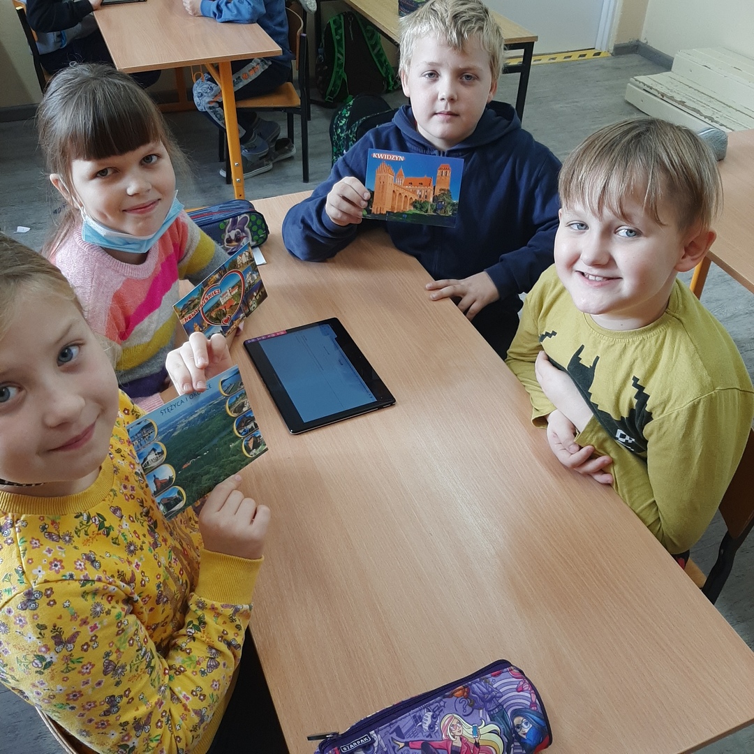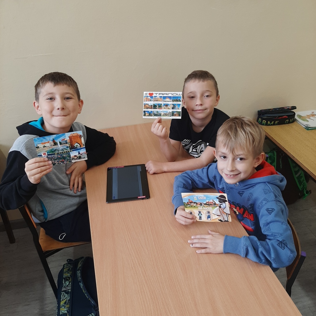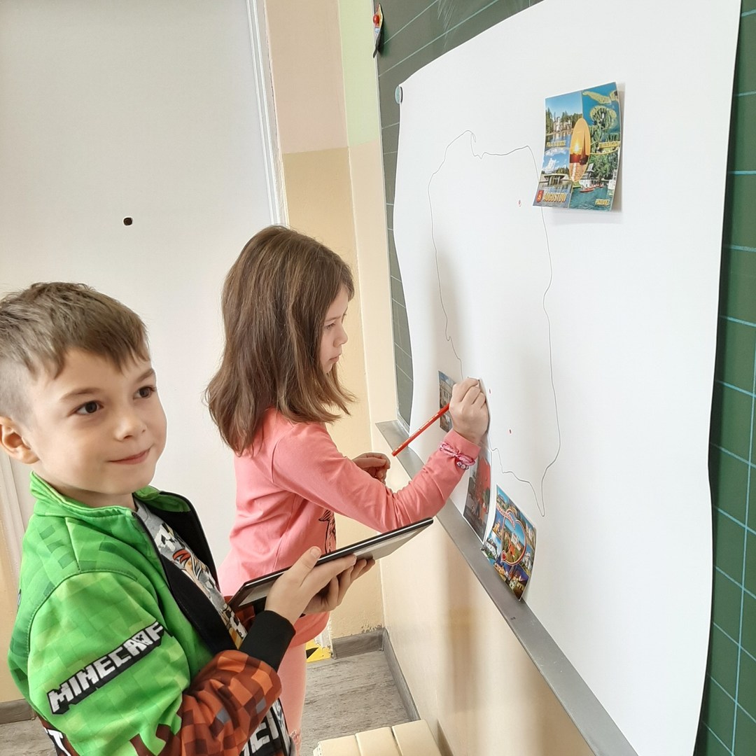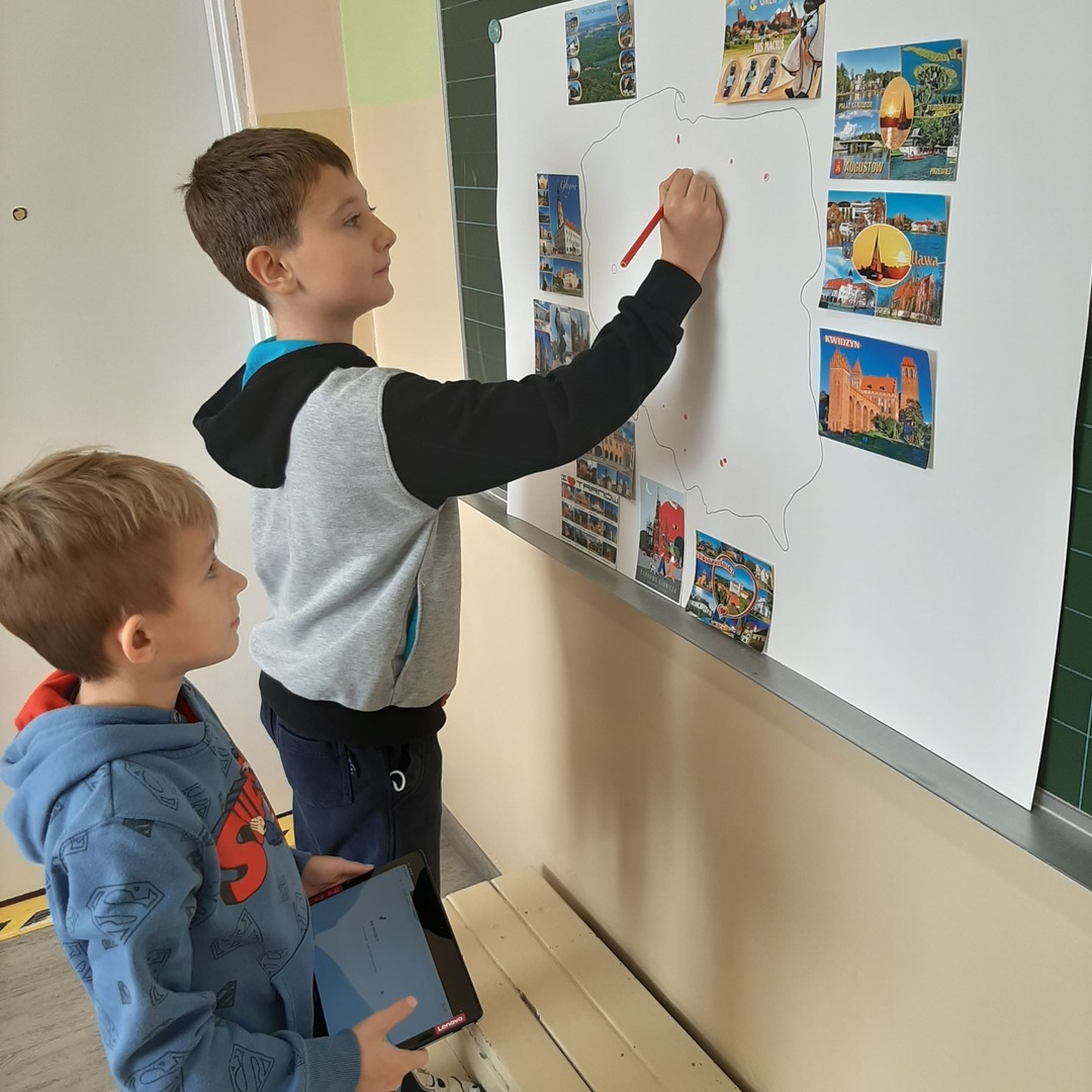 Uczniowie klasy drugiej biorą udział w międzyszkolnej akcji wymiany pocztówkowej. Pod koniec września gościliśmy panią listonosz, która zawiozła wypisane przez dzieci kartki na pocztę. W związku z tym, że już wszystkie szkoły odesłały pocztówki, dziś w ramach pracy w grupach drugoklasiści z pomocą tabletów i tablicy multimedialnej wyszukiwali na mapie Polski miejscowości z których otrzymali pozdrowienia i stworzyli piękną gazetkę klasową.