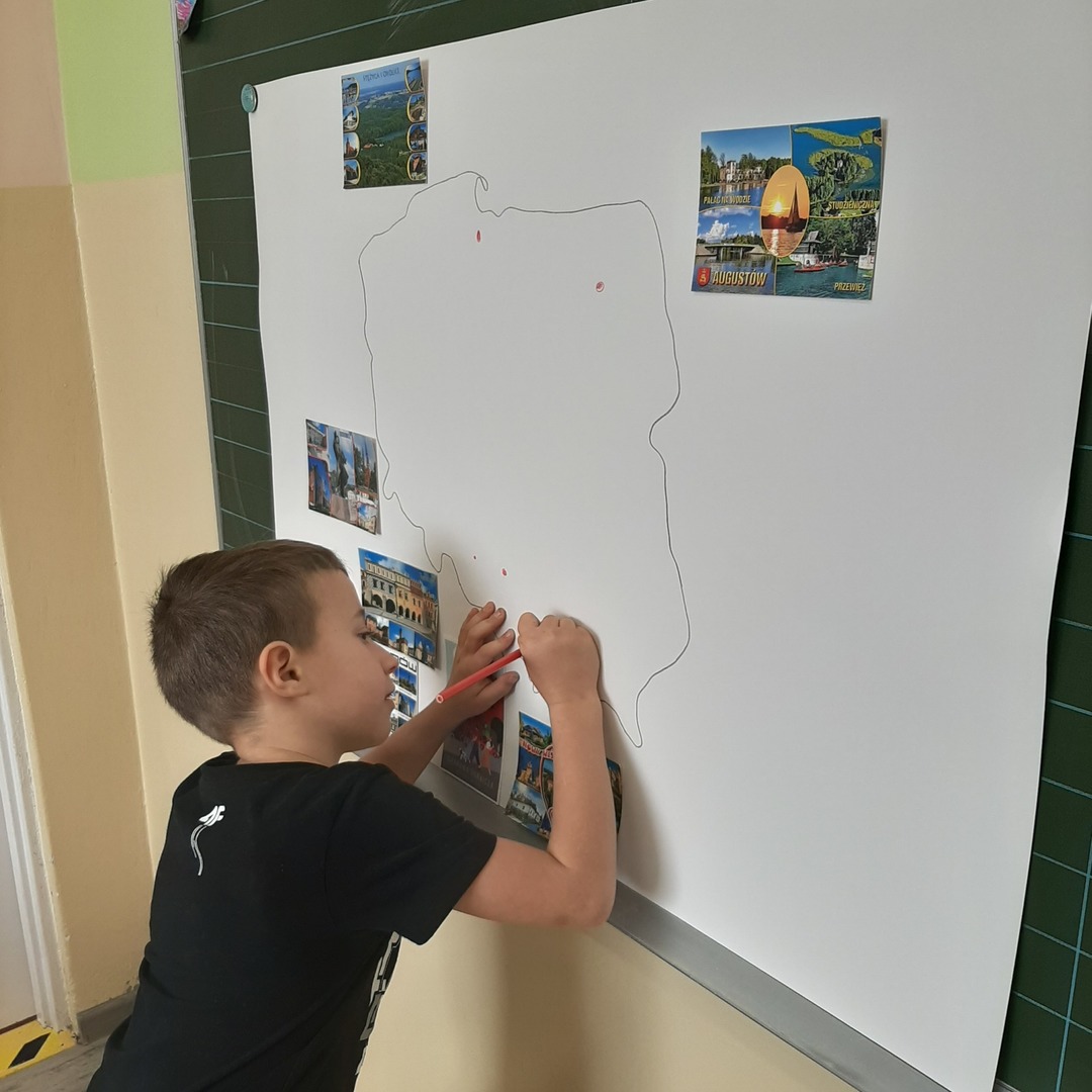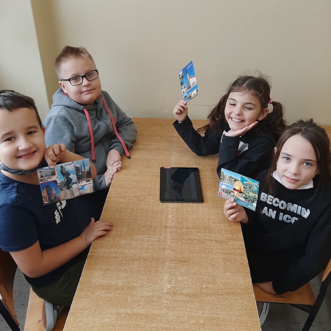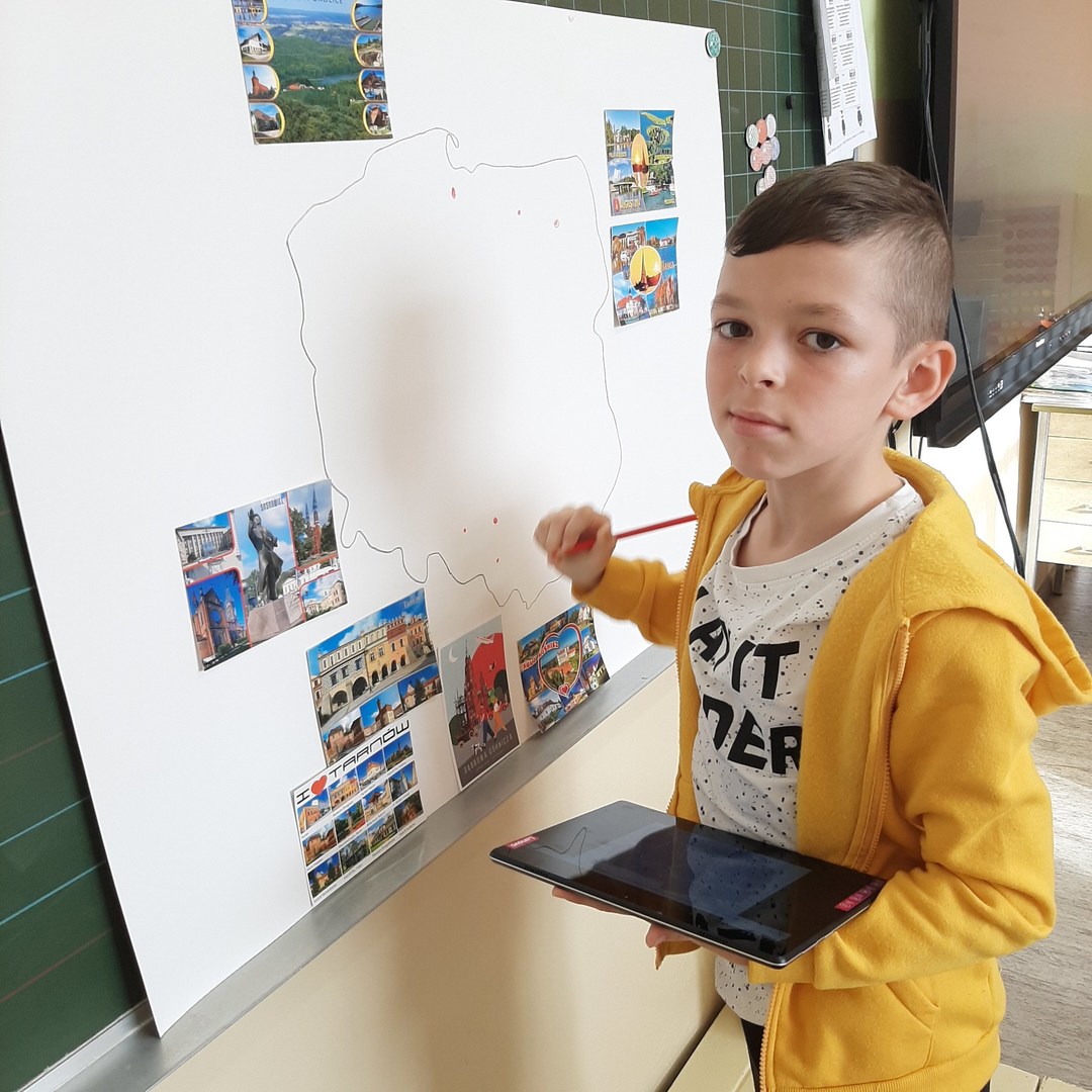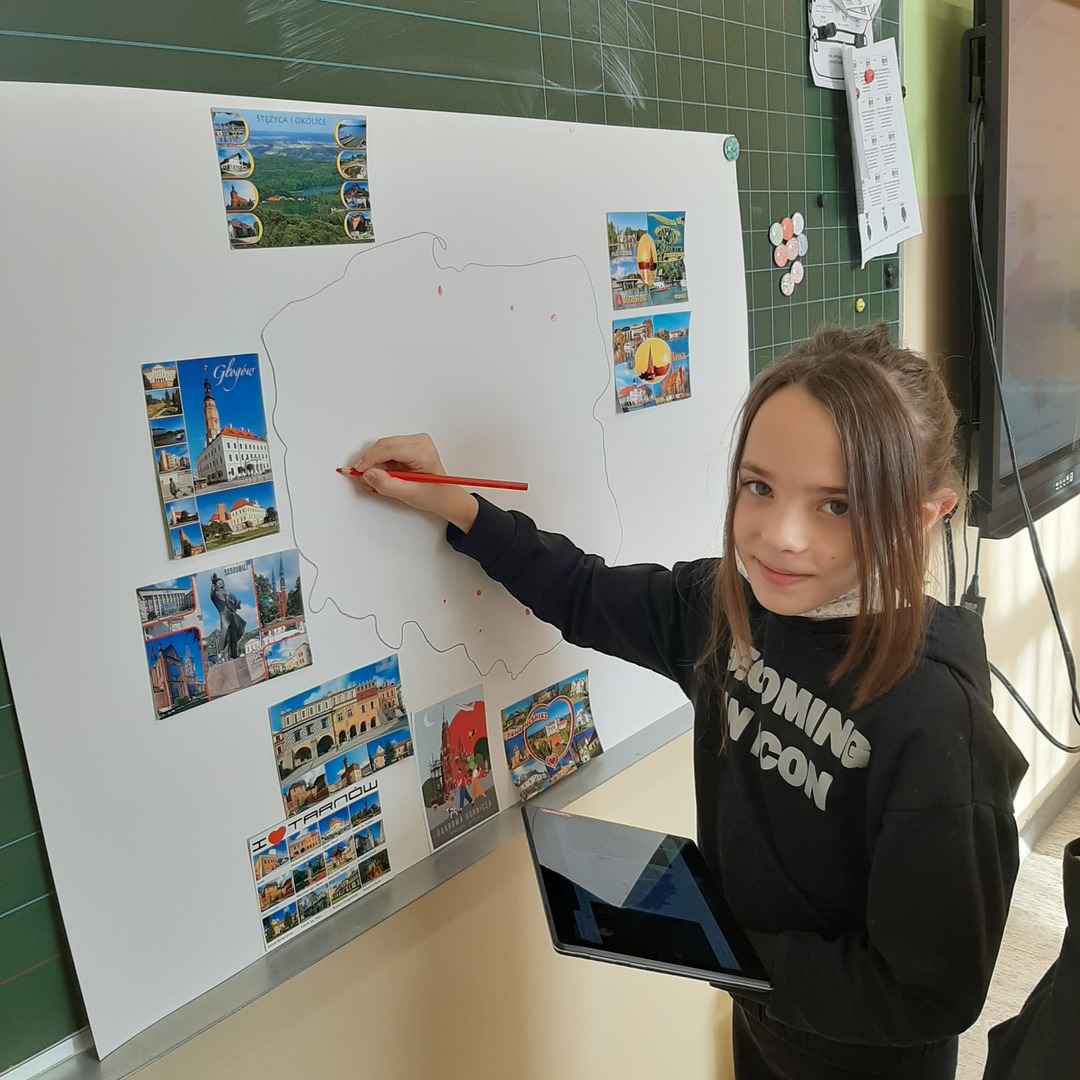 Uczniowie klasy drugiej biorą udział w międzyszkolnej akcji wymiany pocztówkowej. Pod koniec września gościliśmy panią listonosz, która zawiozła wypisane przez dzieci kartki na pocztę. W związku z tym, że już wszystkie szkoły odesłały pocztówki, dziś w ramach pracy w grupach drugoklasiści z pomocą tabletów i tablicy multimedialnej wyszukiwali na mapie Polski miejscowości z których otrzymali pozdrowienia i stworzyli piękną gazetkę klasową.