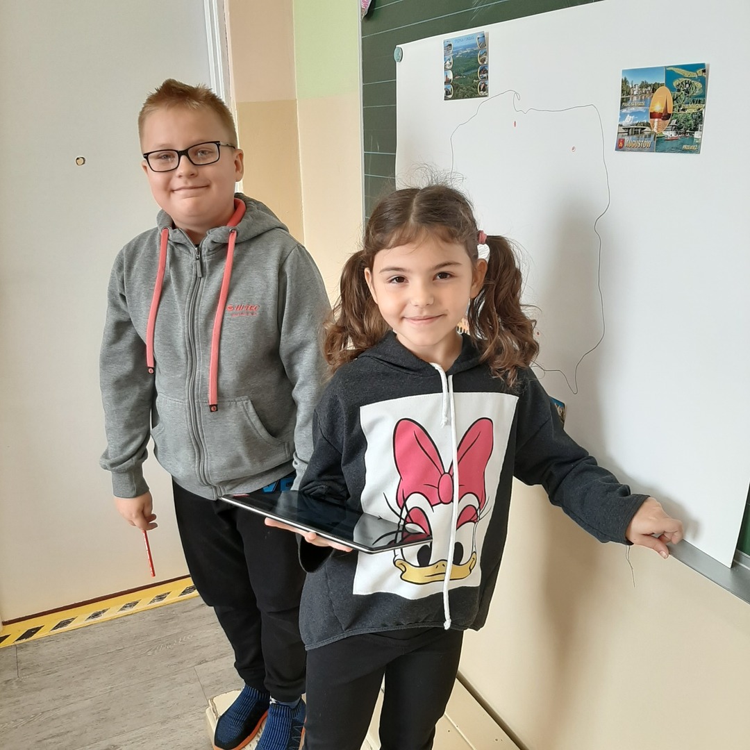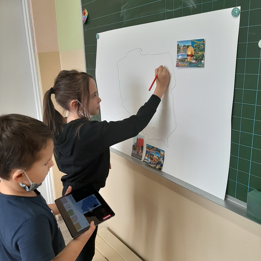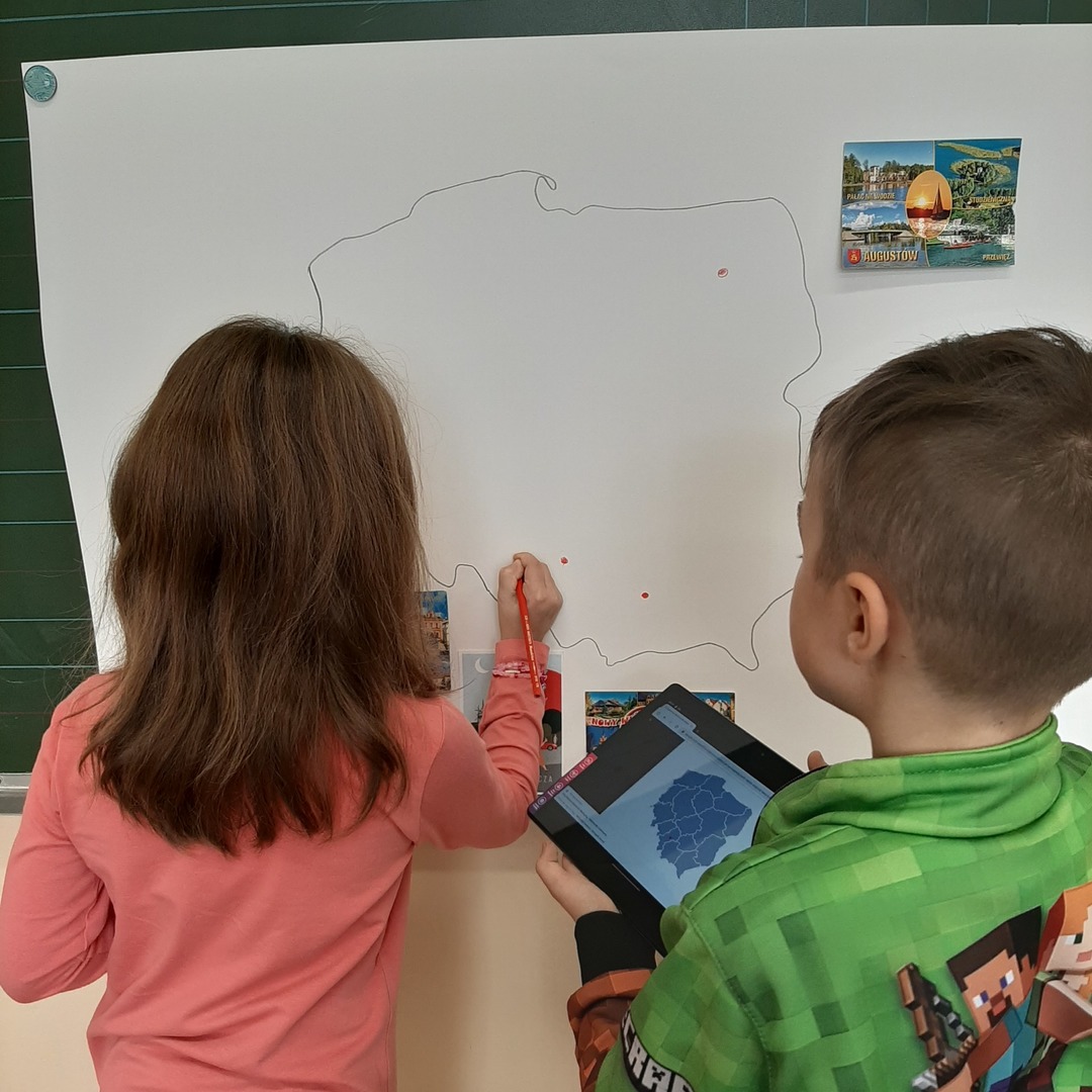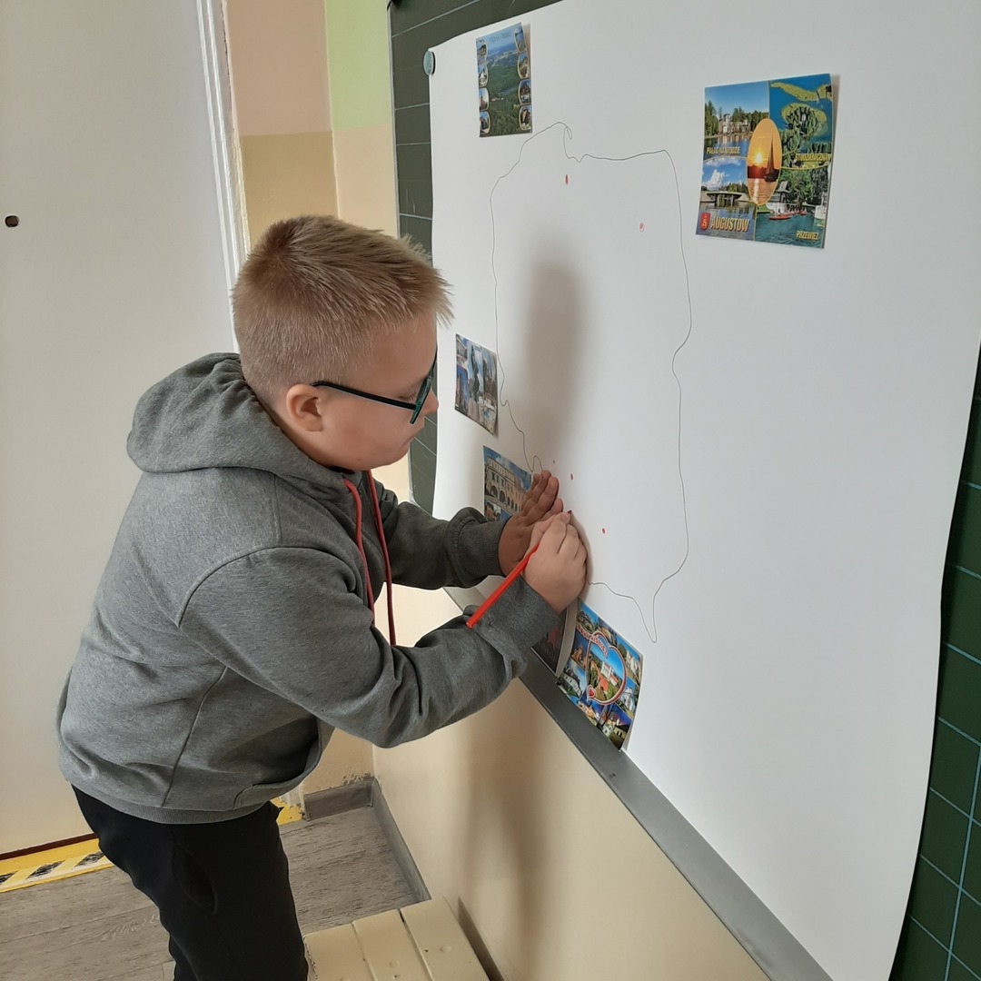 Uczniowie klasy drugiej biorą udział w międzyszkolnej akcji wymiany pocztówkowej. Pod koniec września gościliśmy panią listonosz, która zawiozła wypisane przez dzieci kartki na pocztę. W związku z tym, że już wszystkie szkoły odesłały pocztówki, dziś w ramach pracy w grupach drugoklasiści z pomocą tabletów i tablicy multimedialnej wyszukiwali na mapie Polski miejscowości z których otrzymali pozdrowienia i stworzyli piękną gazetkę klasową.