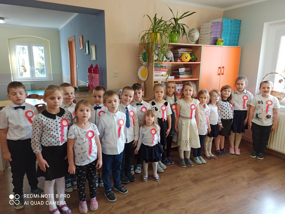 10 listopada nasze przedszkolaki świętowały tak ważny dzień dla każdego Polaka, czyli Narodowe Święto Niepodległości. Wszystkie dzieci odświętnie ubrane, wykonały kotyliony, obejrzały film edukacyjny o 11 listopada i symbolach narodowych.Na zakończenie o godzinie 11:15 z zachowaniem właściwej postawy odśpiewały hymn Polski „Mazurka Dąbrowskiego” biorąc tym samym udział w akcji MEN ,,SZKOŁA DO HYMNU".