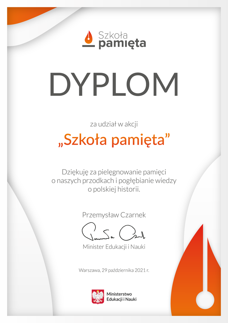 Szanowni Państwo Dyrektorzy, w imieniu Ministra Edukacji i Nauki Przemysława Czarnka serdecznie dziękuję za udział w akcji „Szkoła pamięta”. Miło mi poinformować, że w tegorocznej inicjatywie wzięło udział blisko 11 tysięcy przedszkoli, szkół i placówek oświatowych. W załączeniu przekazuję pamiątkowy dyplom. Zachęcam Państwa do zapoznania się z komunikatem podsumowującym akcję. Znajdą go Państwo na naszej stronie internetowej https://www.gov.pl/web/edukacja-i-nauka/prawie-11-tys-wzielo-udzial-w-akcji-szkolapamieta--dziekujemy. Z wyrazami szacunku |