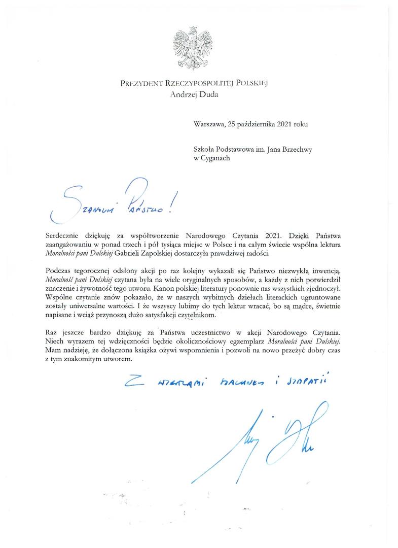 Narodowe Czytanie 2021 – podziękowanie z Kancelarii Prezydenta RP