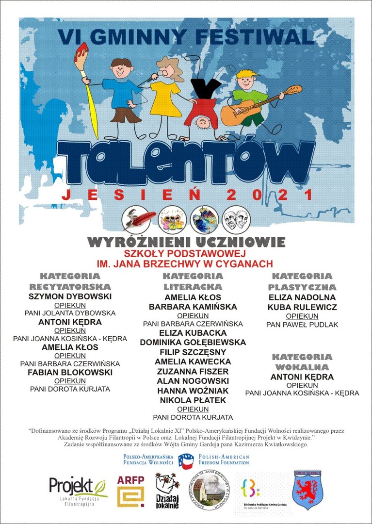 Nasze przedsięwzięcie nie było by możliwie bez wsparcia Wójta Gminy Gardeja pana Kazimierza Kwiatkowskiego oraz zostało dofinasowane ze środków programu „Działaj Lokalnie XI” Polsko – Amerykańskiej Fundacji Wolności realizowanego przez Akademię Rozwoju Filantropii w Polsce oraz Lokalną Fundację Filantropijną Projekt.