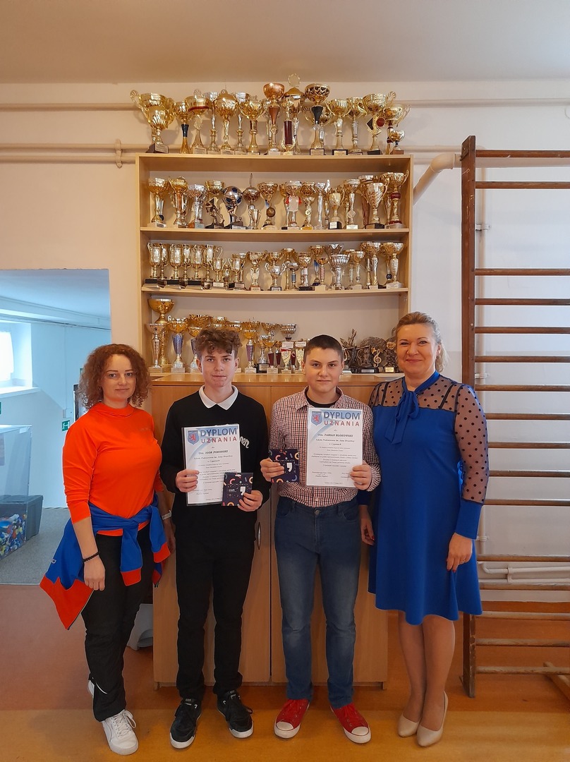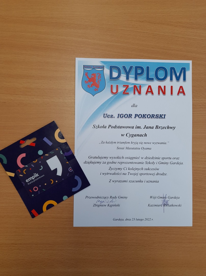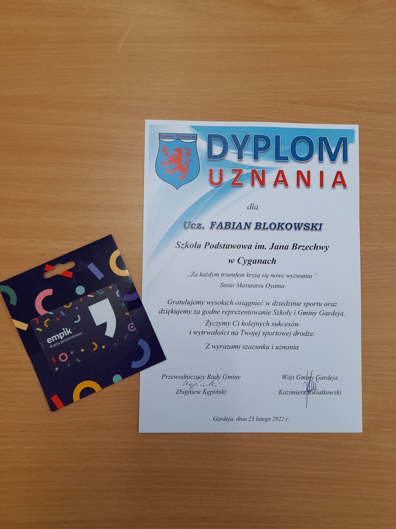 Wójt Gminy Gardeja Kazimierz Kwiatkowski nagrodził uczniów naszej szkoły Fabiana Blokowskiego i Igora Pokorskiego za wysokie osiągnięcia w dziedzinie sportu oraz godne reprezentowanie Szkoły i Gminy Gardeja. Dyplomy uznania, gratulacje i karty prezentowe w imieniu Pana Wójta wręczył Dyrektor Szkoły Pani Małgorzata Kamińska, gratulacje przekazał również nauczyciel wychowania fizycznego Pani Dorota Redzińska. Serdecznie gratulujemy naszym uczniom życząc im kolejnych sukcesów i wytrwałości na drodze sportowej.