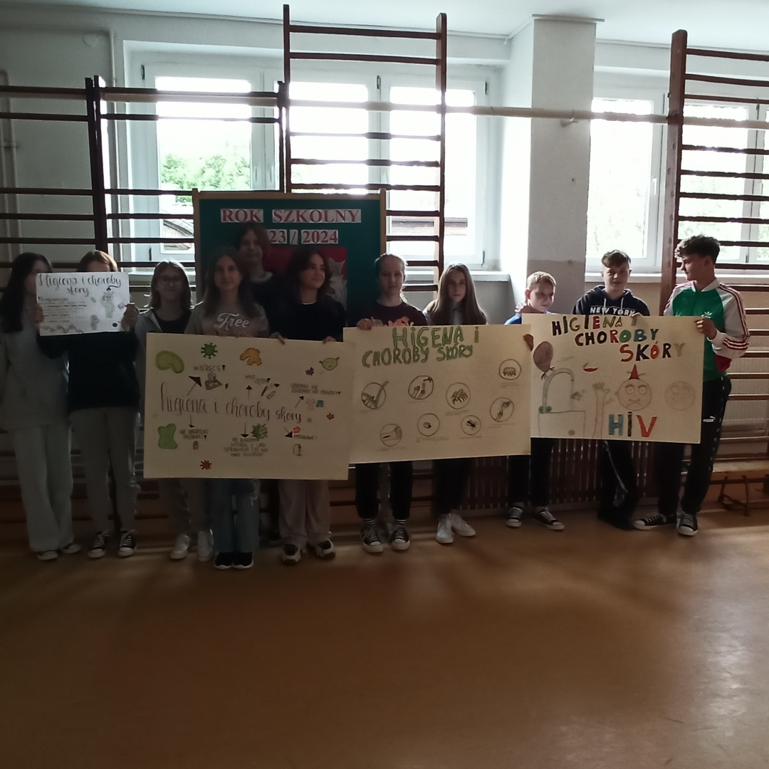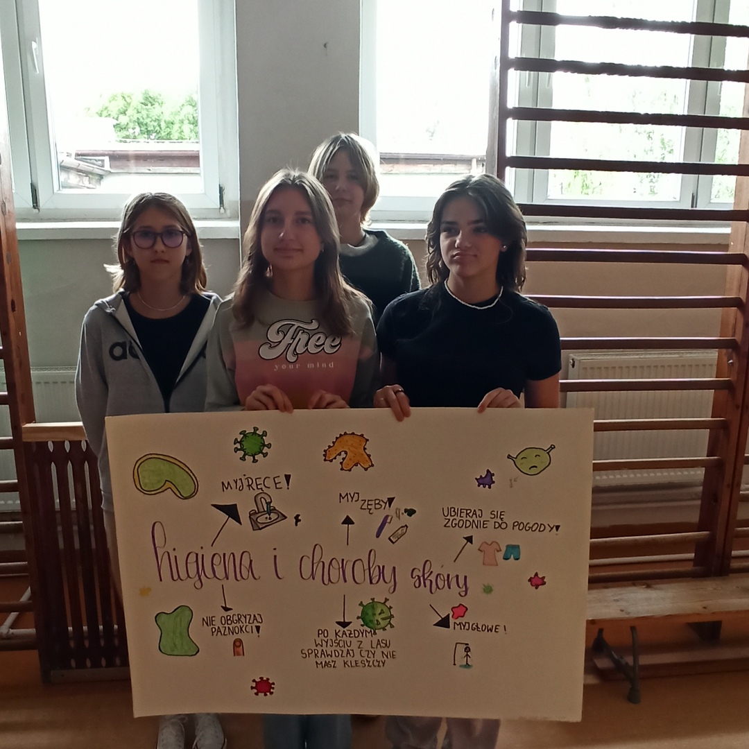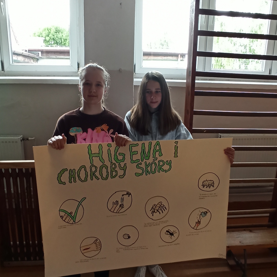 Na jednej z ostatnich lekcji biologii uczniowie klasy VII, pracując w grupach wykonali ciekawe plakaty dotyczące chorób i higieny skóry. Poszczególni liderzy grup w ciekawy sposób zaprezentowali swoje projekty. Dowiedzieliśmy się, że podstawowy sposób zapobiegania chorobom skóry to regularne mycie całego ciała. Wiemy, że bakterie, pasożyty, wirusy i grzyby mogą wywoływać poważne choroby skóry. Bardzo ważna jest również ochrona skóry przed promieniowaniem UV, które zwiększa ryzyko zachorowania na nowotwory złośliwe skóry (czerniak).