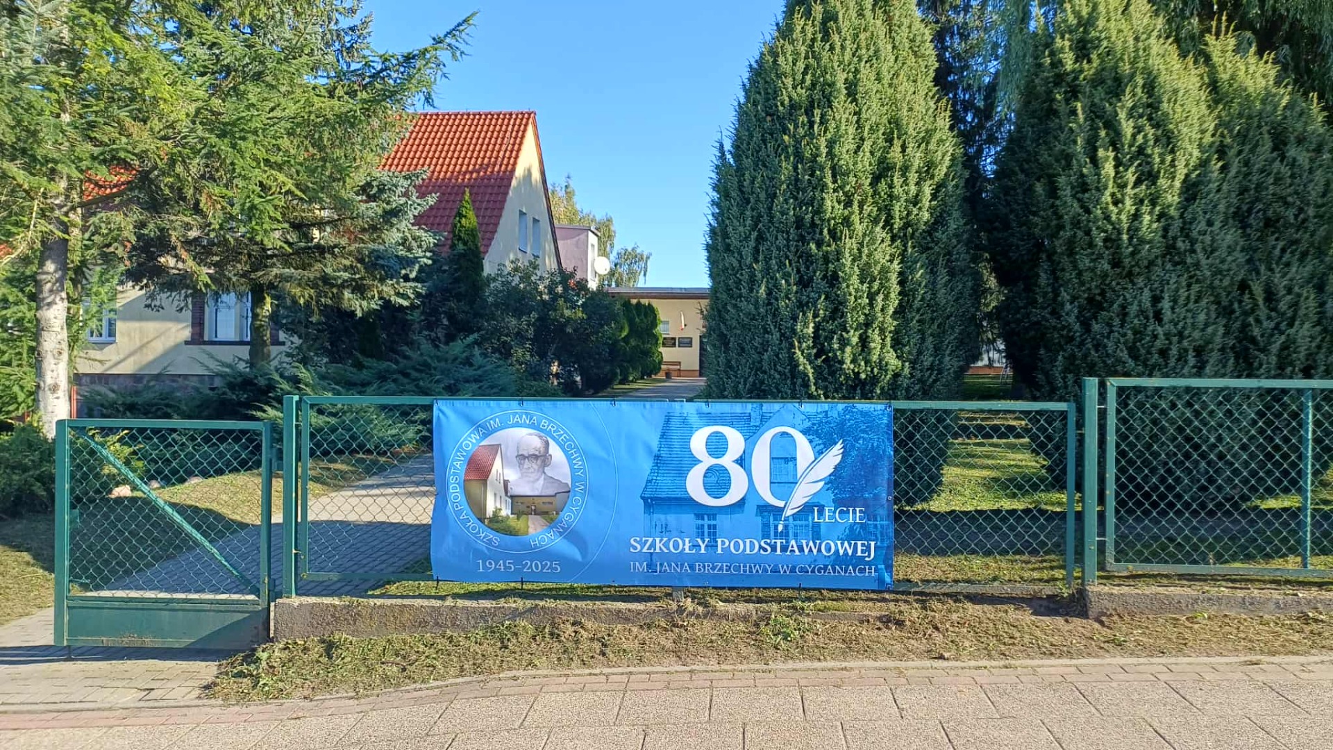 Z okazji zbliżającego się Jubileuszu 80-lecia Szkoły Podstawowej im. Jana Brzechwy w Cyganach przed budynkiem szkoły zawisł wyjątkowy baner. To symbol radości, dumy i wdzięczności za minione lata, a jednocześnie zaproszenie do wspólnego świętowania tego niezwykłego wydarzenia.