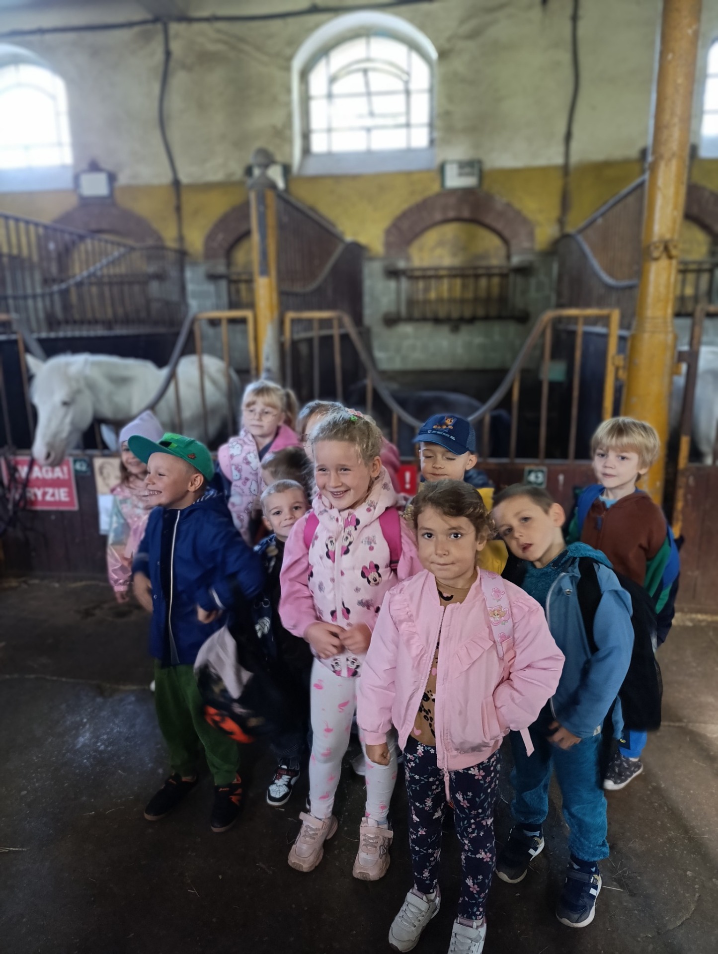 Następnie dzieci zwiedziły stajnię, gdzie mogły z bliska obserwować konie i dowiedzieć się, jak wygląda codzienna praca instruktora i stajennego. Z zaciekawieniem słuchały opowieści o żywieniu, pielęgnacji i zwyczajach tych pięknych zwierząt. Wielu uczniów po raz pierwszy miało okazję zobaczyć zaplecze stajni i dowiedzieć się, jak wiele troski wymaga opieka nad końmi.