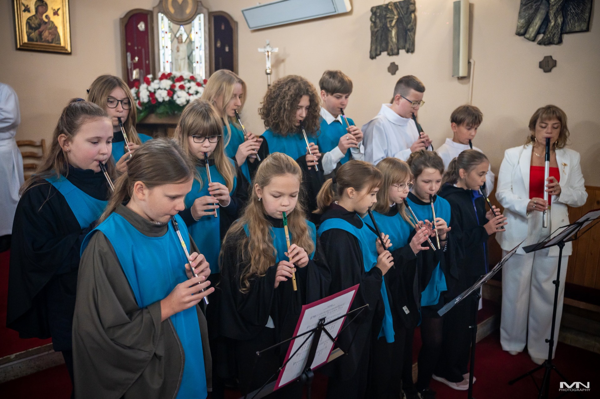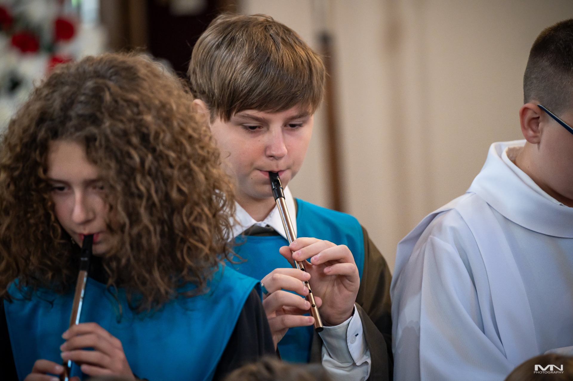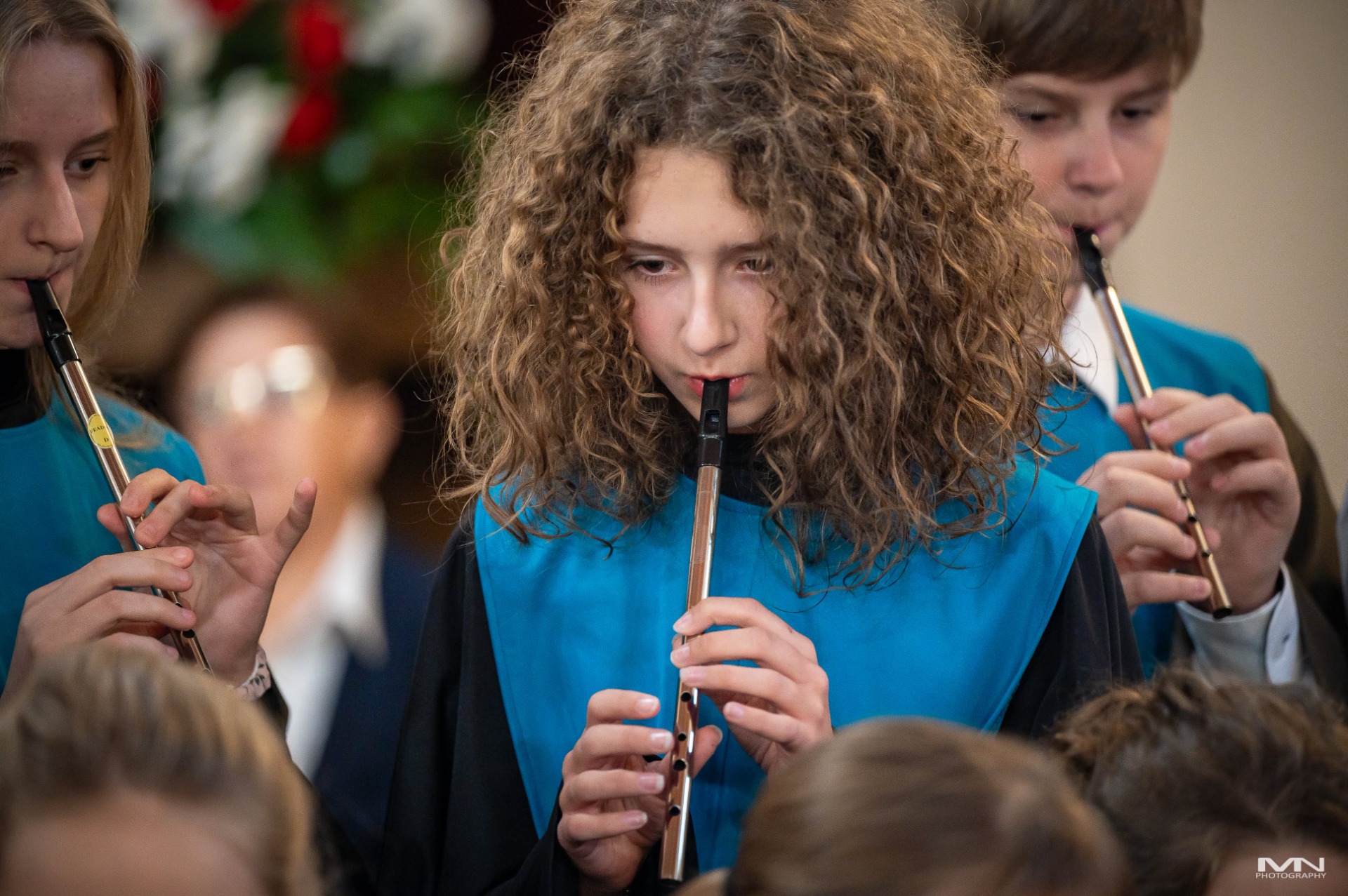 Nie zabrakło także pięknej oprawy muzycznej. Wystąpił zespół flażoletowy „Flauto Dolce”, przygotowany przez panią Annę Kowalczyk, a grą na organach uroczystość uświetniła nasza absolwentka – Monika Fiszer.