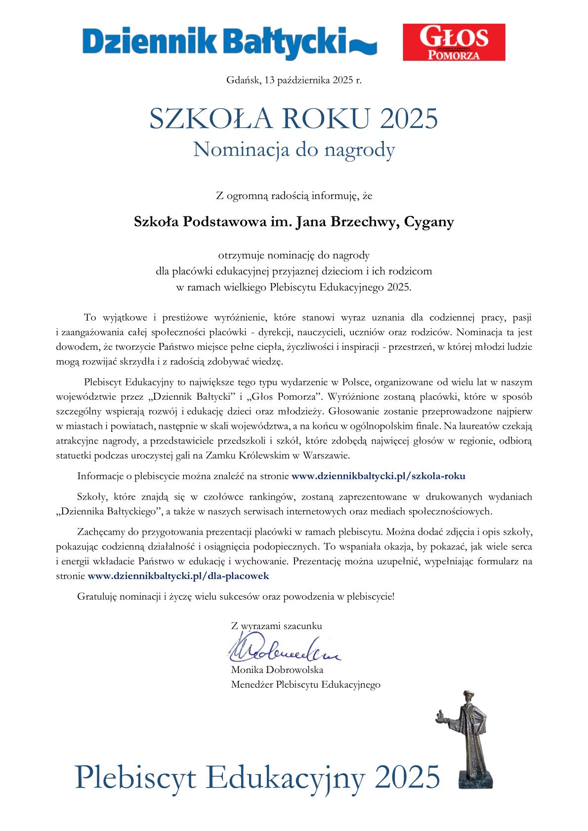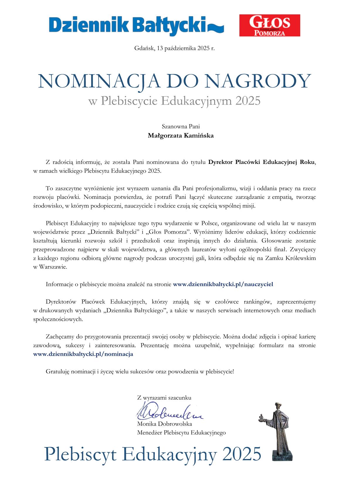 Z radością informujemy, że redakcje Dziennika Bałtyckiego i Głosu Pomorza poinformowały naszą placówkę, iż nasza szkoła została zgłoszona do nagrody w kategorii Szkoła Roku w Wojewódzkiej Edycji Plebiscytu Edukacyjnego 2025.