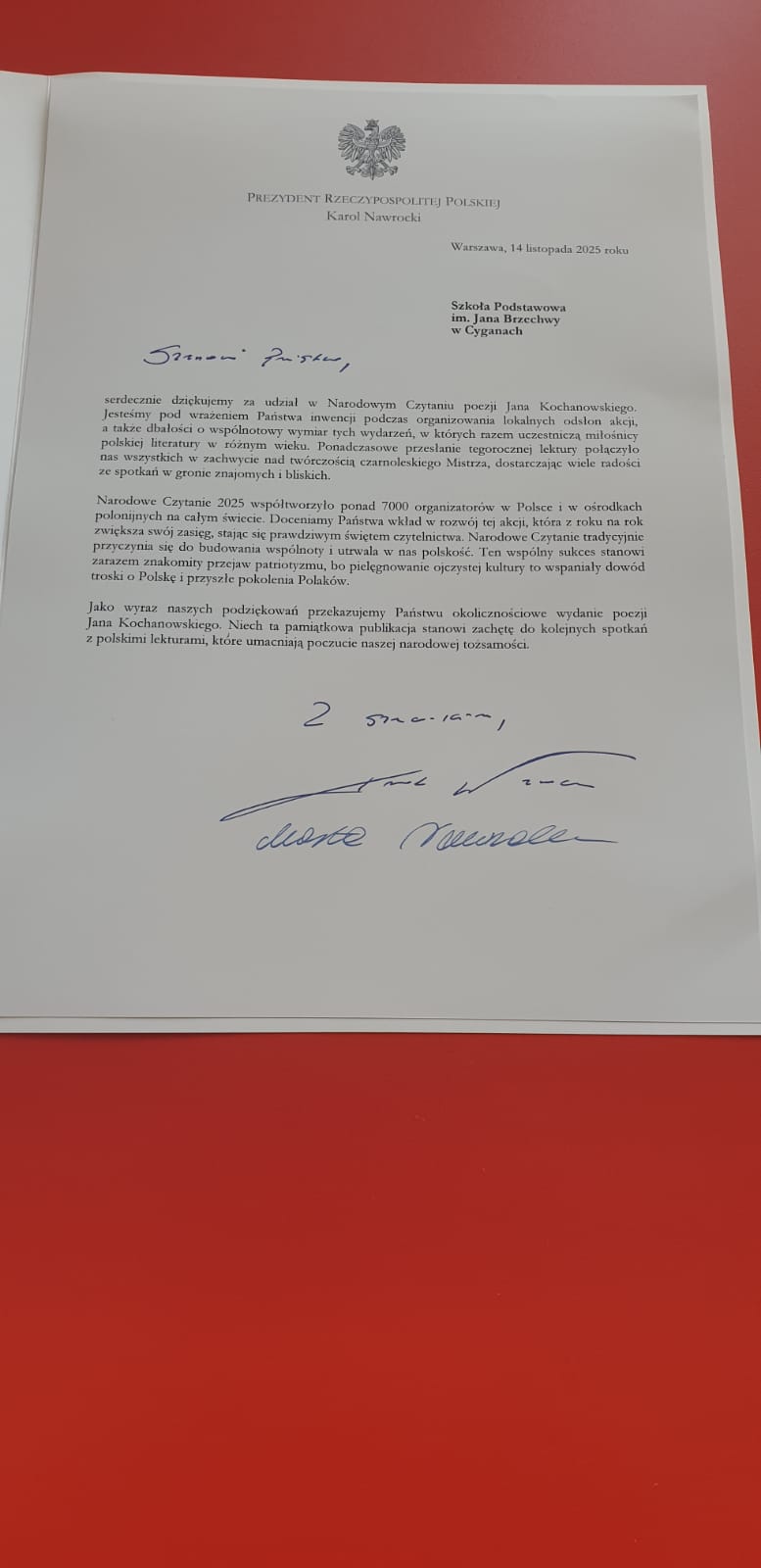 Nasza szkoła była we wrześniu 2025 roku jednym z 7000 uczestników Narodowego Czytania. Uczniowie klas IV- VIII czytali utwory Jana Kochanowskiego. To coroczne przedsięwzięcie czytelnicze utwierdza nas w przekonaniu, że czytanie uczy, wzbogaca i pielęgnuje ojczystą mowę i literaturę. Czujemy się zaszczyceni wyróżnieniem pary prezydenckiej Karola i Marty Nawrockich. List pana Prezydenta wraz z pięknym wydaniem poezji Jana Kochanowskiego znajdzie poczesne miejsce w naszej bibliotece szkolnej. Info. i foto. Barbara Czerwińska.
